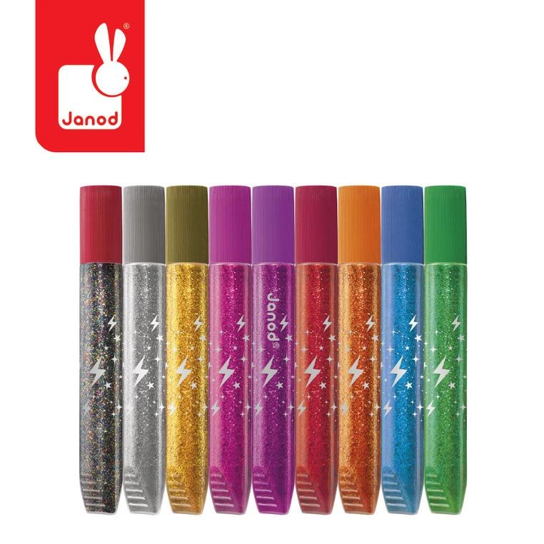 Zestaw 9 brokatowych klejów francuskiej marki JANOD w pięknych kolorach, w tym: złotym, srebrnym, miedzianym i grafitowym z wielobarwnymi drobinkami brokatu. Tubki są poręczne i mają dzióbek, ułatwiający aplikację. Zestaw zapakowany jest w estetyczne kartonowe pudełko z dziecięcą grafiką.