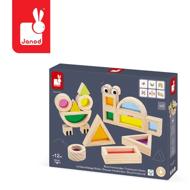 Janod Klocki drewniane przeźroczyste kolorowe sensoryczne 12 m+