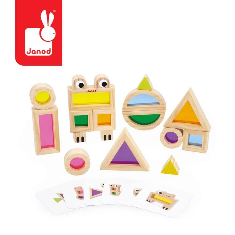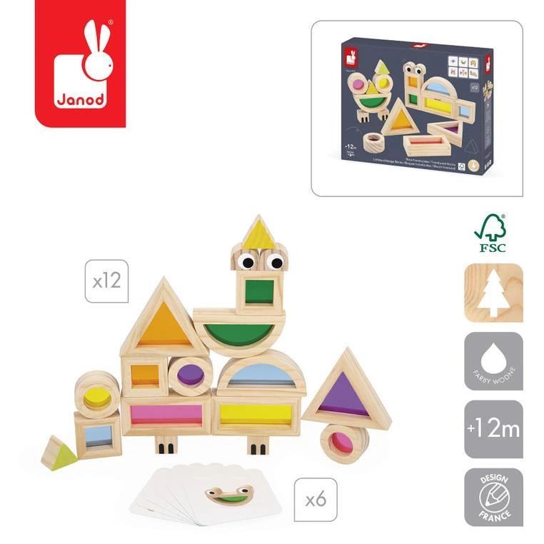 Drewniane przeźroczyste klocki sensoryczne francuskiej marki JANOD to piękna i pomysłowa zabawka kreatywna dla dzieci od 1. roku życia. Elementy (12 sztuk) o geometrycznych kształtach mają jasne drewniane ramki i bezpieczne nietłukące się kolorowe „szybki”, przepuszczające światło wewnątrz. Dodatkowo w zestawie znajduje się 6 mniejszych drewnianych klocków: 2 trójkąty, dwa sześciany-łapki oraz 2 oczka. Klocki można układać dowolnie lub odtwarzać wzory znajdujące się na dołączonych do zestawu kartach (6 sztuk), tworząc oryginalne konstrukcje czy stworzenia.