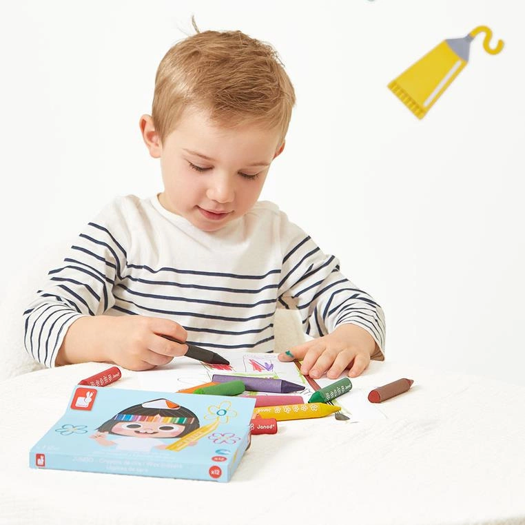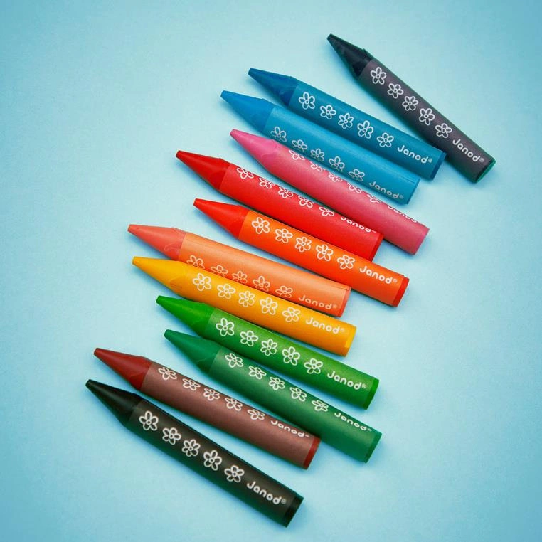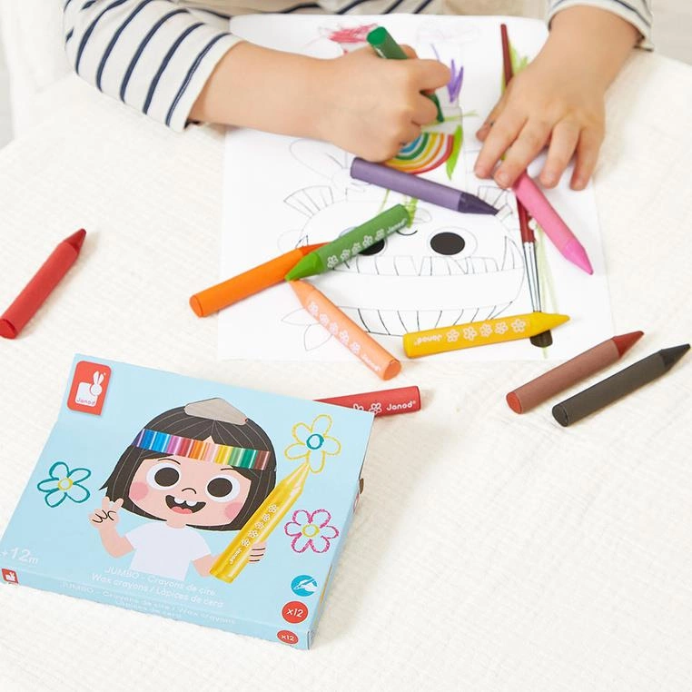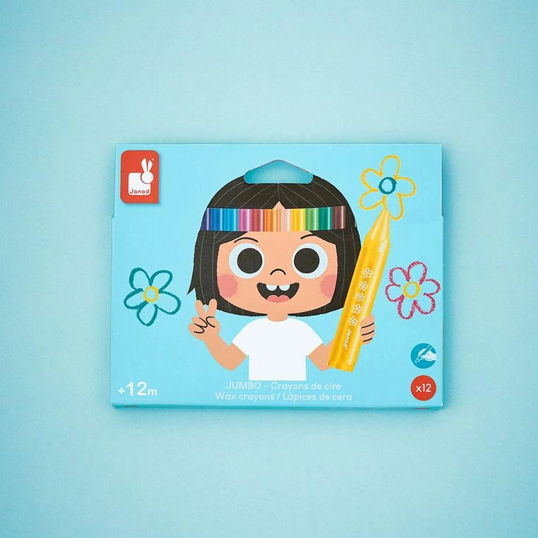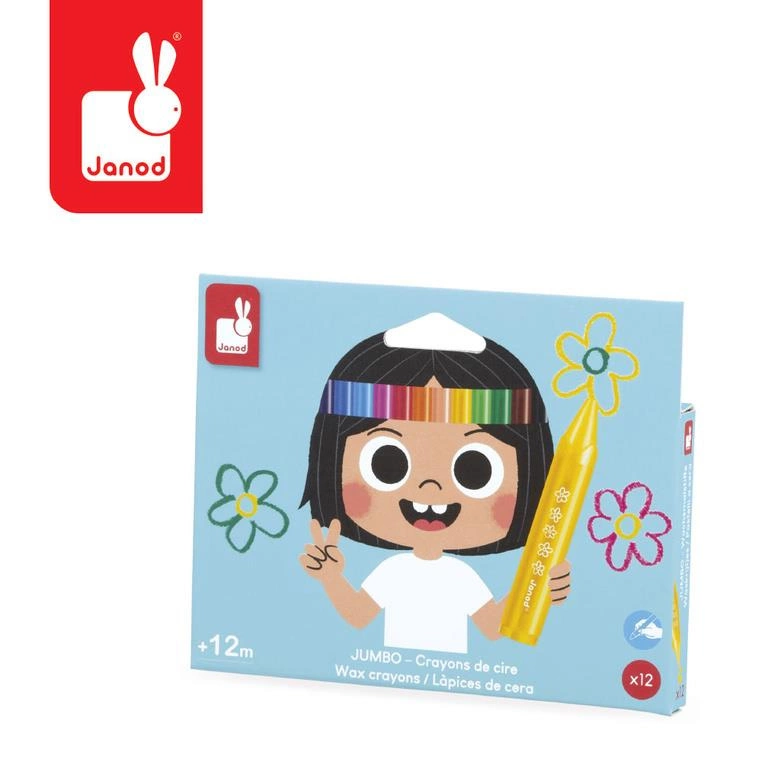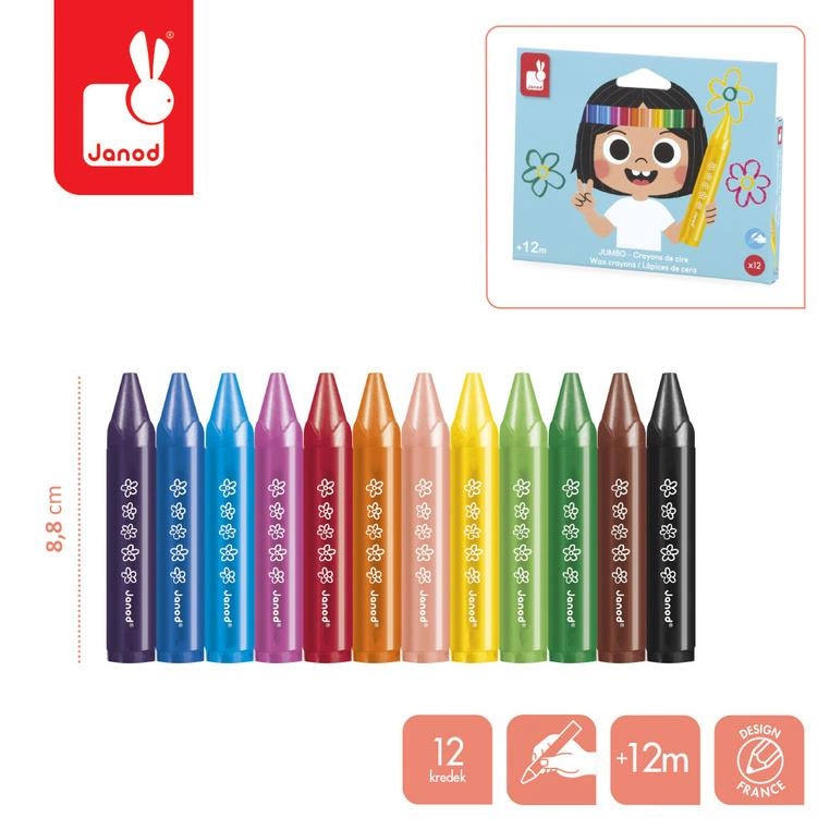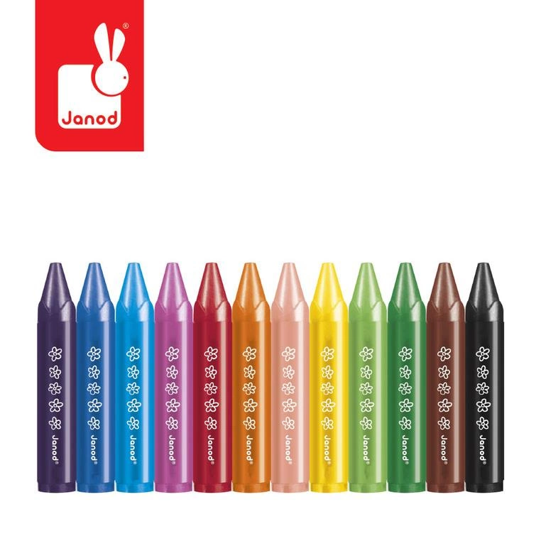 Zestaw 12 kredek woskowych francuskiej marki JANOD w pięknych, intensywnych kolorach. Kredki są grube, poręczne, z okrągłymi uchwytami. Zapakowane w estetyczne kartonowe pudełko z dziecięcą grafiką.