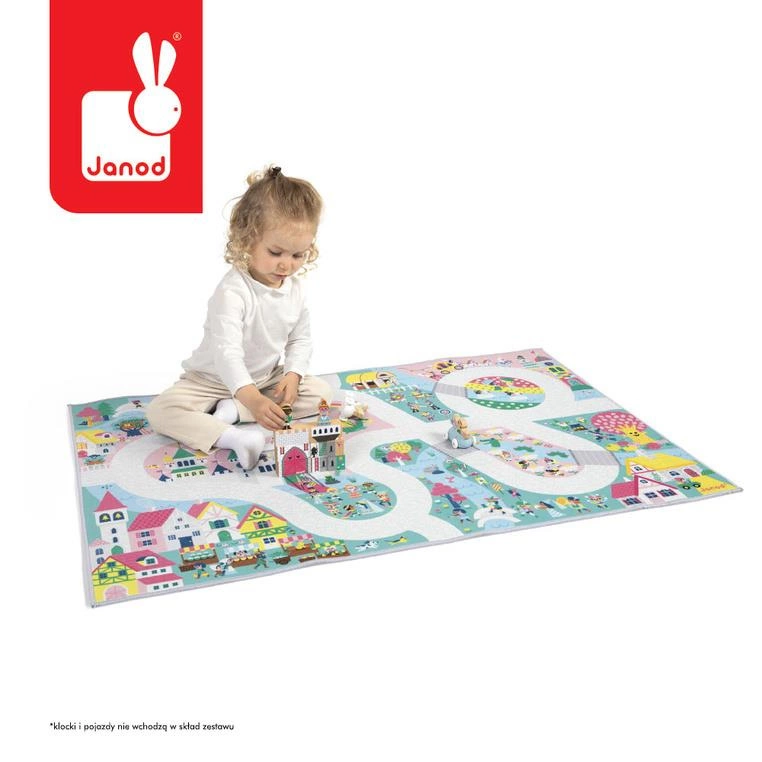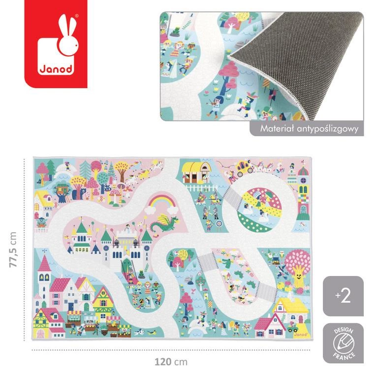 Mata-dywan do zabawy z drogą Zaczarowane królestwo z kolekcji Cross Roads francuskiej marki JANOD to idealny prezent dla dzieci już od 2. roku życia. Ma spore rozmiary 120 x 77,5 cm, jest przyjemna w dotyku oraz pozostaje na swoim miejscu, dzięki antypoślizgowej warstwie spodniej. Mata przedstawia bogaty w szczegóły świat bajek i baśni, w którym dziecko może za każdym razem odkrywać coś nowego. Znajdzie w nim różne postacie oraz charakterystyczne dla bajecznego świata miejsca m.in. królewski zamek, wieża czy ogród elfów, a wszystkie punkty łączy sieć dróg. Mata Zaczarowane królestwo zabierze najmłodszych w magiczną podróż z nauką kolorów i instrumentów muzycznych w tle.