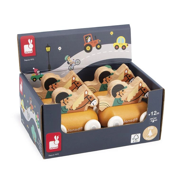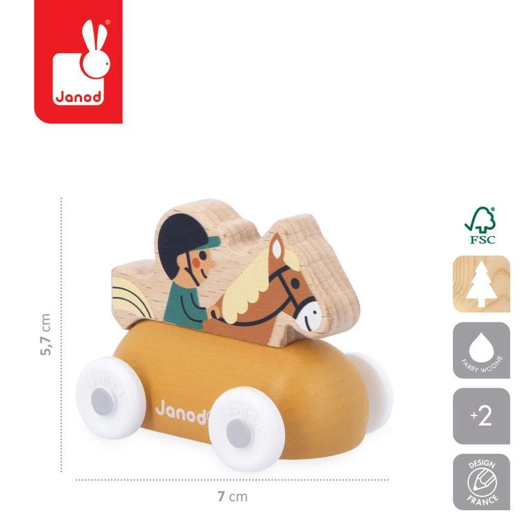 Pojazd z jeźdźcem konnym z serii Cross Roads francuskiej marki JANOD to doskonałe uzupełnienie maty-dywanu do zabawy z drogą Biała Dolina z tej samej kolekcji. Pojazd wykonany jest z drewna, posiada poręczne kształty dopasowane do małych rączek, karmelowy kolor, a dzięki kółkom łatwo porusza się po różnych powierzchniach. W środku znajduje się uśmiechnięty dżokej i jego ogier, co zachęca malucha do snucia własnych historii i kreatywnej zabawy.
