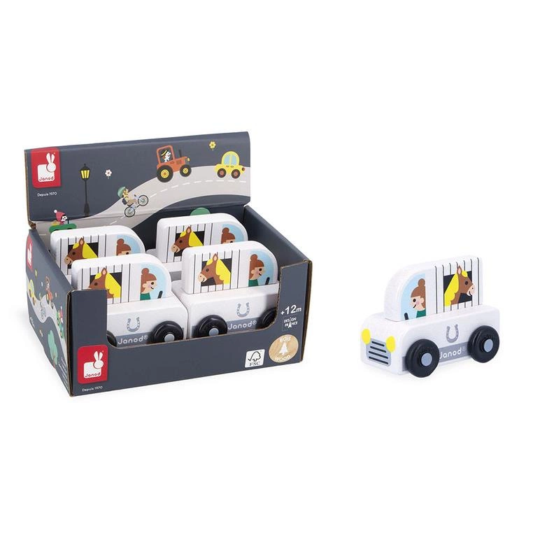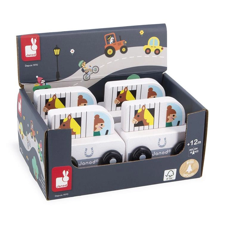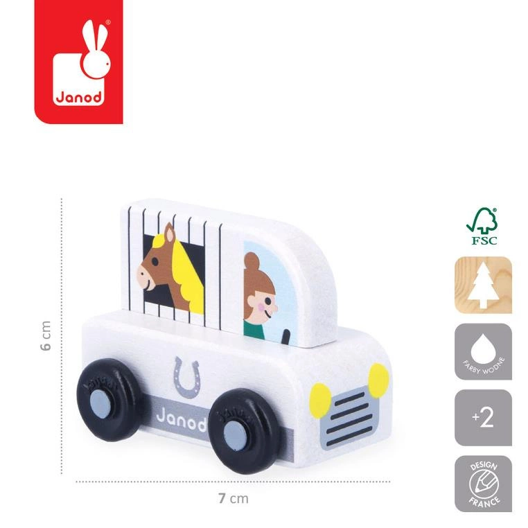 Koniowóz z serii Cross Roads francuskiej marki JANOD to doskonałe uzupełnienie maty-dywanu do zabawy z drogą Wieś z tej samej kolekcji. Pojazd wykonany jest z drewna, posiada poręczne kształty dopasowane do małych rączek, jasny kolor, a dzięki kółkom łatwo porusza się po różnych powierzchniach. W środku znajduje się uśmiechnięta rolniczka i konik, co zachęca malucha do snucia własnych historii i kreatywnej zabawy.