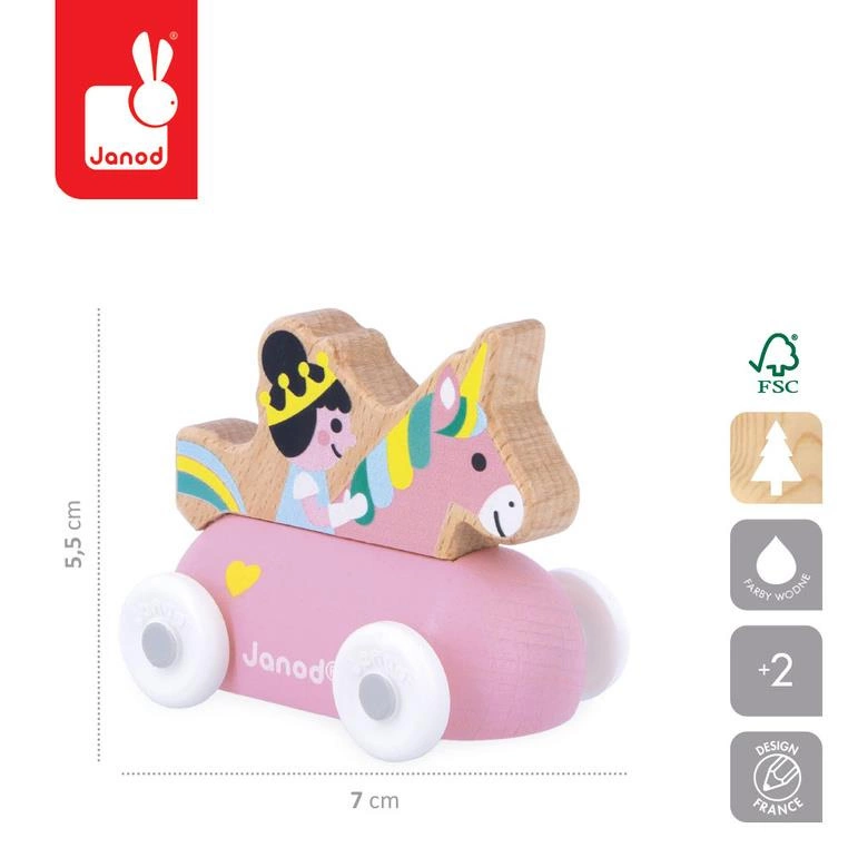 Pojazd z księżniczką i jednorożcem z serii Cross Roads francuskiej marki JANOD to doskonałe uzupełnienie maty-dywanu do zabawy z drogą Zaczarowane królestwo z tej samej kolekcji. Pojazd wykonany jest z drewna, posiada poręczne kształty dopasowane do małych rączek, różowy kolor, a dzięki kółkom łatwo porusza się po różnych powierzchniach. W środku znajdują się księżniczka i jednorożec z tęczową grzywą, co zachęca malucha do snucia własnych historii i kreatywnej zabawy.