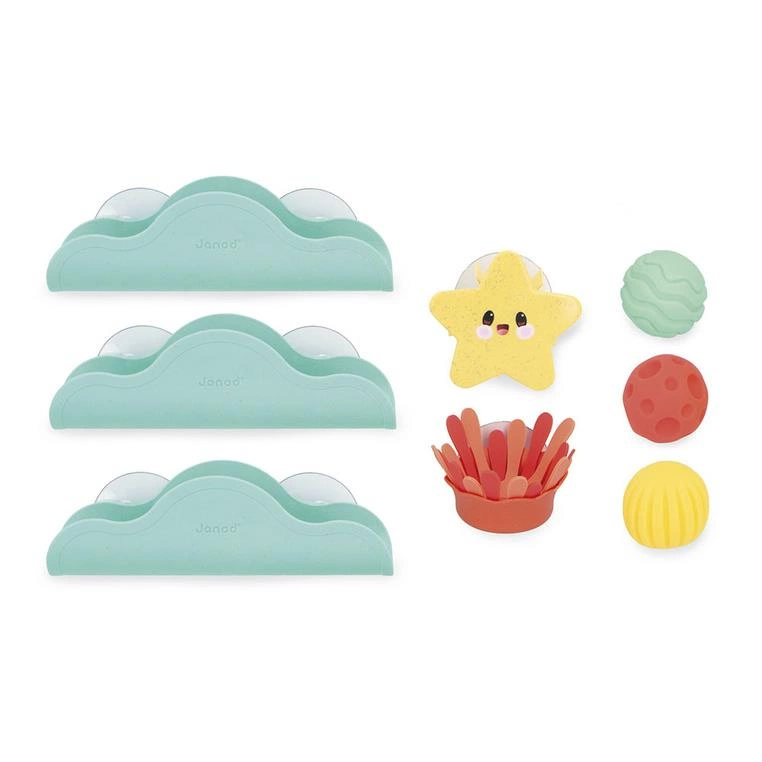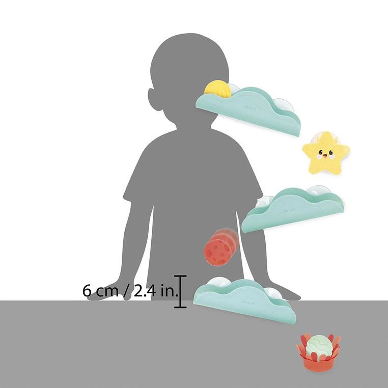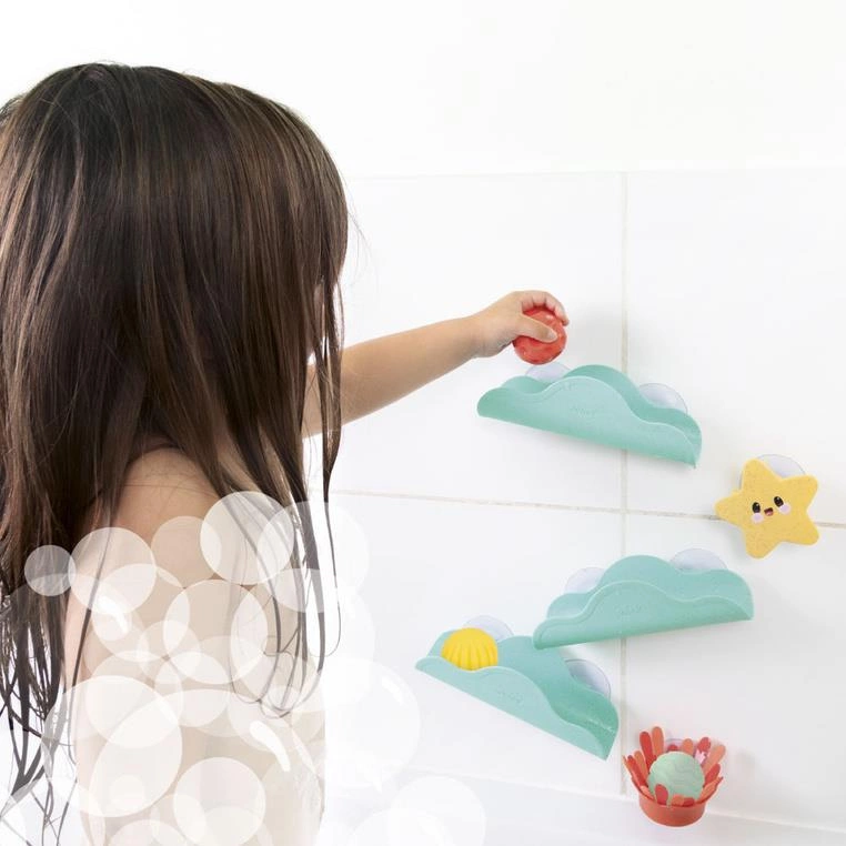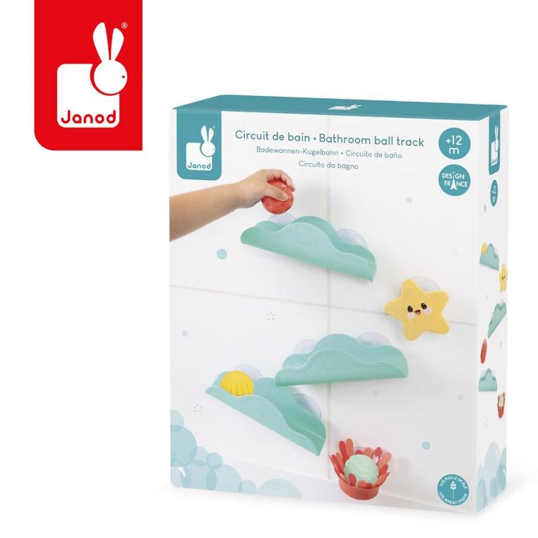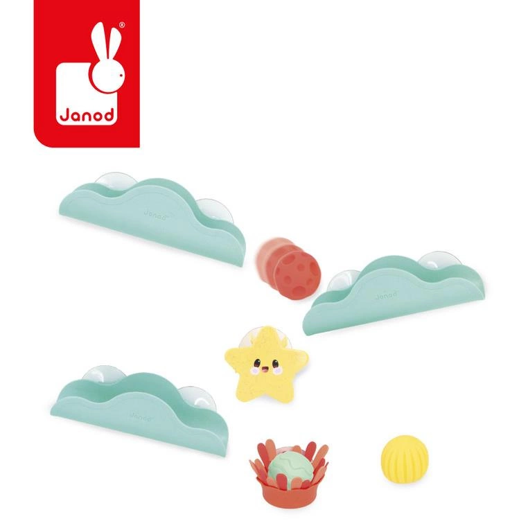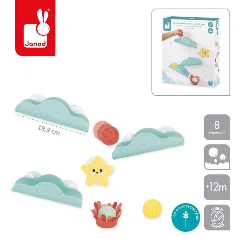 Tor do kąpieli z piłeczkami francuskiej marki JANOD to zestaw składający się z 3 falistych ramp z przyssawkami, 3 piłeczek sensorycznych, które można puszczać po samodzielnie stworzonym torze, 1 przeszkody w kształcie rozgwiazdy z przyssawką oraz kubeczka-koralowca z przyssawką, który pełni rolę mety. Tor można zamocować do wanny lub płytek w łazience w dowolnej konfiguracji. To doskonały sposób na umilenie maluszkowi czasu spędzanego w wannie. Zabawkę zaprojektowano we Francji. Idealnie nadaje się na prezent.