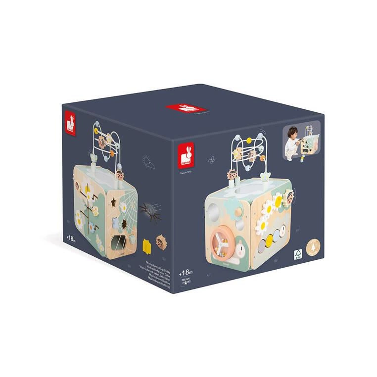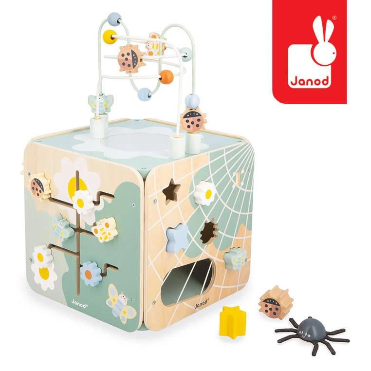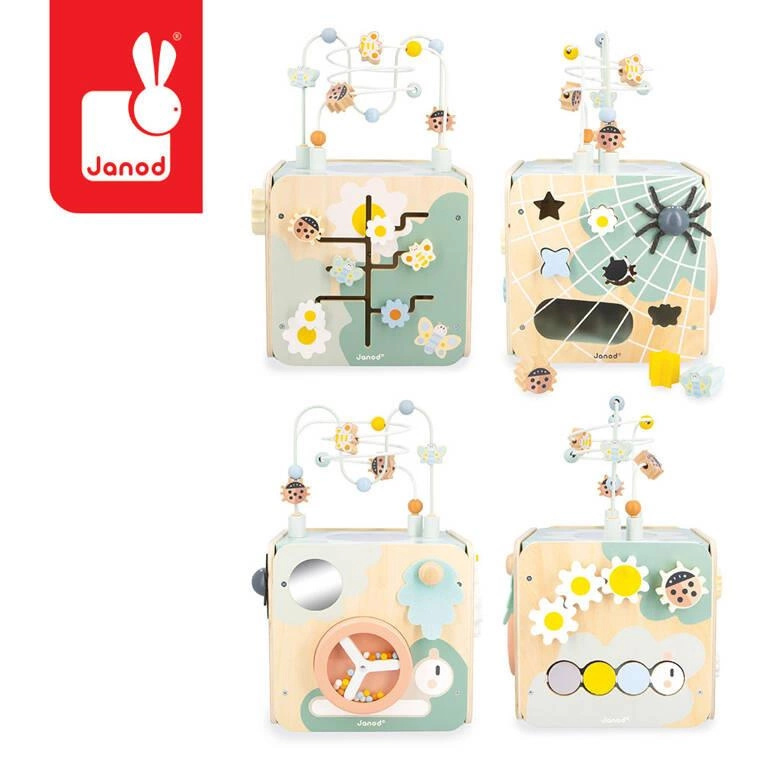 Duża drewniana wielofunkcyjna kostka edukacyjna Ogród z serii Sweet Cocoon francuskiej marki JANOD to idealna zabawka od 18. miesiąca życia. Ma bezpieczny kształt z zaokrąglonymi brzegami. Zachwyca estetyką wykonania i pięknymi kolorami. Elementy na jej ściankach tworzą urokliwy mikroświat, w którym znajdują się dwie pętle z kulkami i owadami do przesuwania, lusterko, 4 kółka zębate – kwiatki i biedronka, gąsienica z 4 obracanymi elementami, drzewo-labirynt z 6-cioma elementami do przesuwania we właściwe miejsce, obracane kółko-grzechotka z kulkami, listek dębu przypinany na napę, sorter kształtów z bryłami do dopasowania czy odczepiany pająk z kółeczkiem od spodu. Zabawka rozwija koordynację ruchową i małą motorykę, trenuje pamięć i logiczne myślenie, uczy rozróżniać kolory i kształty, a nawet zauważać zależności przyczynowo-skutkowe. Wiele różnorodnych funkcji sprawia, że się nie nudzi, a kolory (jasnego drewna, szarości i bieli z elementami pastelowej zieleni, odcieni niebieskiego, żółtego, pomarańczowego i zgaszonego różu) – zachwycają.