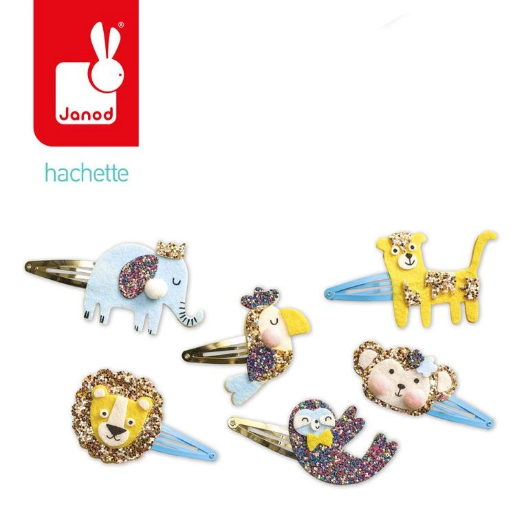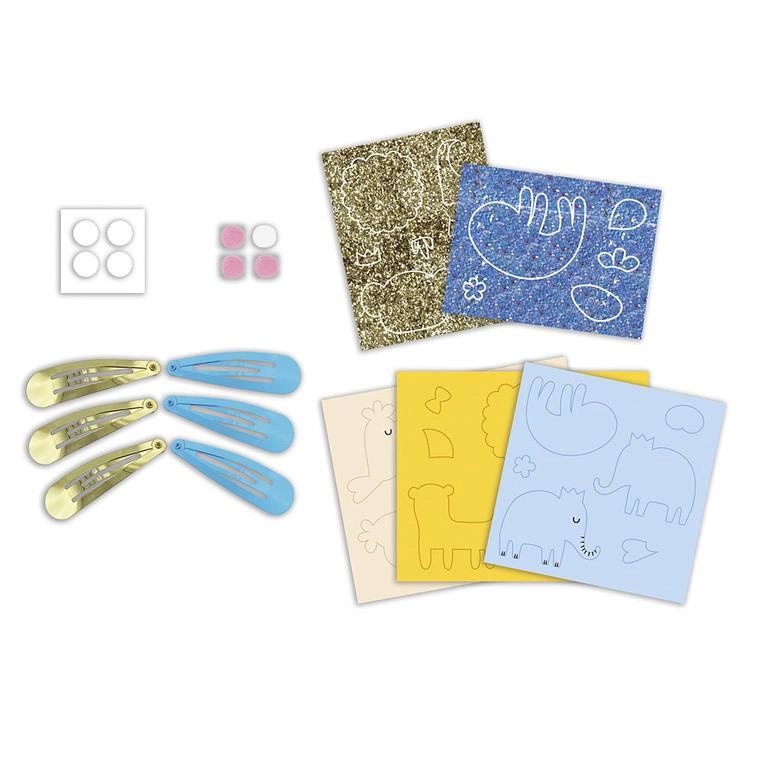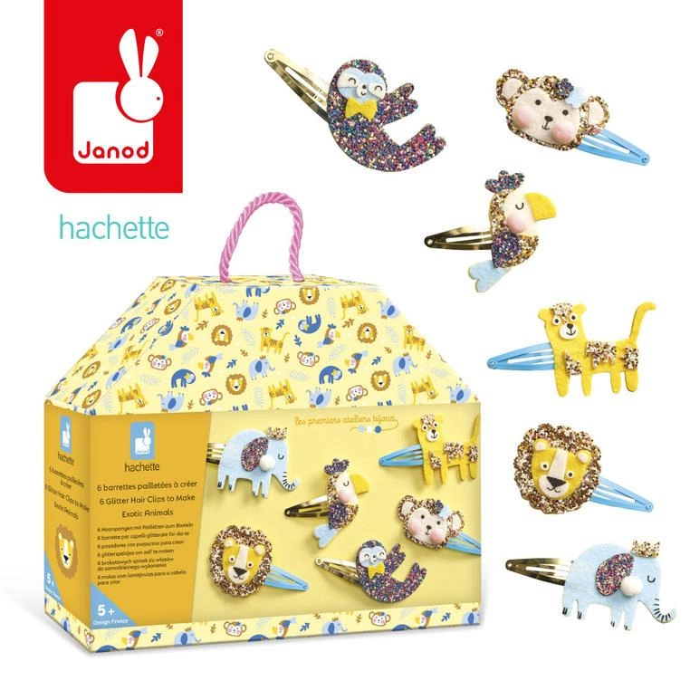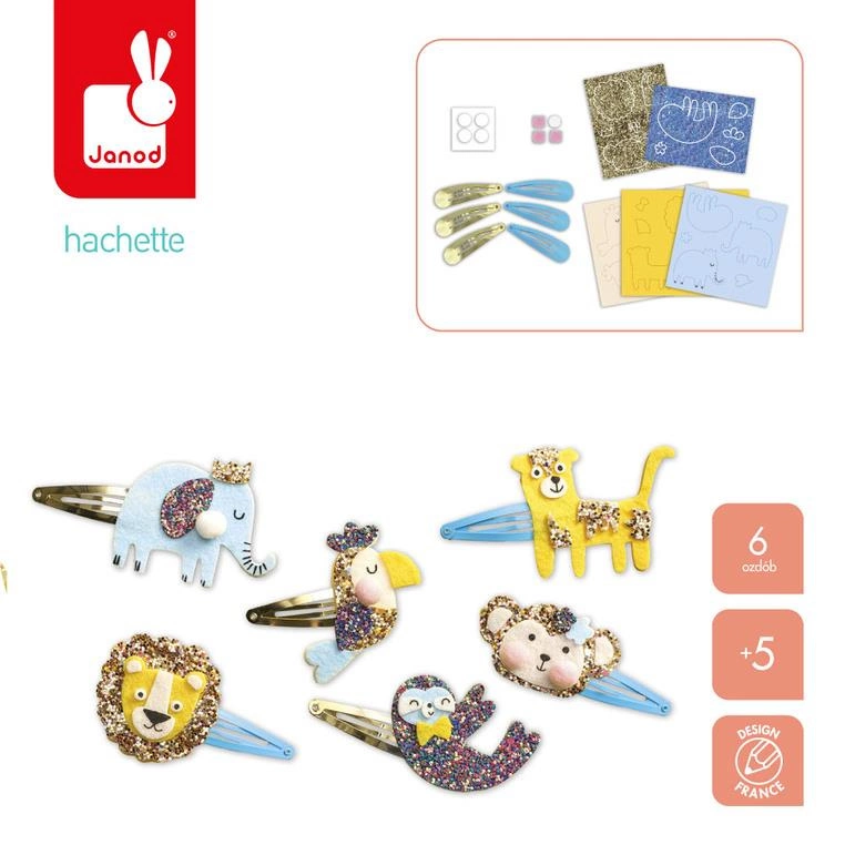 Janod Zestaw kreatywny do tworzenia biżuterii Brokatowe spinki do włosów Egzotyczne zwierzęta 5+