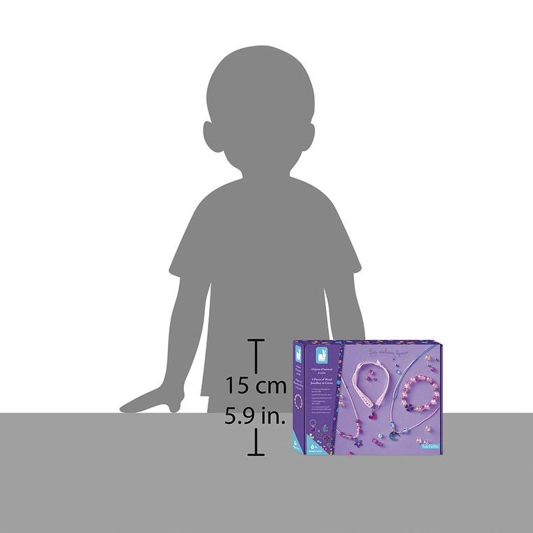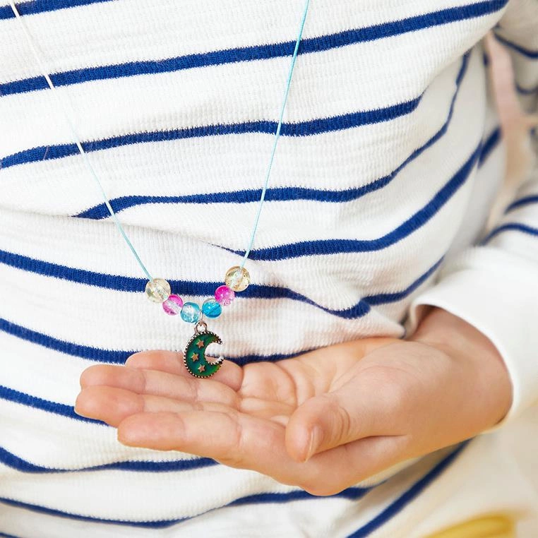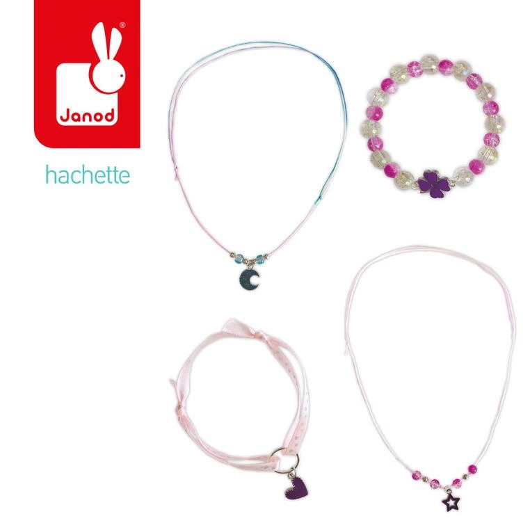 Zestaw kreatywny do tworzenia biżuterii z zawieszkami zmieniającymi kolor francuskiej marki JANOD. Pozwoli stworzyć w sumie aż 4 sztuki ozdób: 2 naszyjniki i 2 bransoletki. W jego skład wchodzą: koraliki w różnych kolorach (różowe, srebrne, niebieskie, brokatowe), 2 nitki (różowa i tęczowa), wstążka w serduszka oraz 4 wyjątkowe zawieszki – serce, gwiazda, księżyc i koniczyna – "magicznie" zmieniające kolor w kontakcie ze skórą (pod wpływem ciepła).