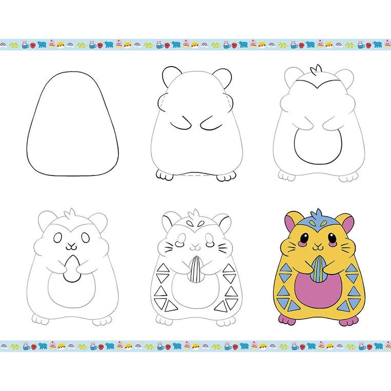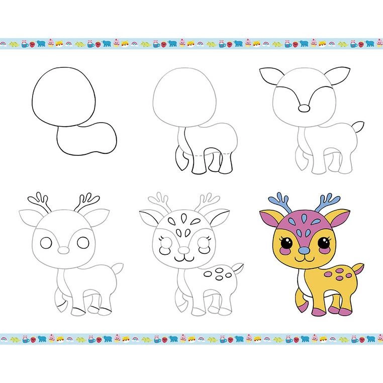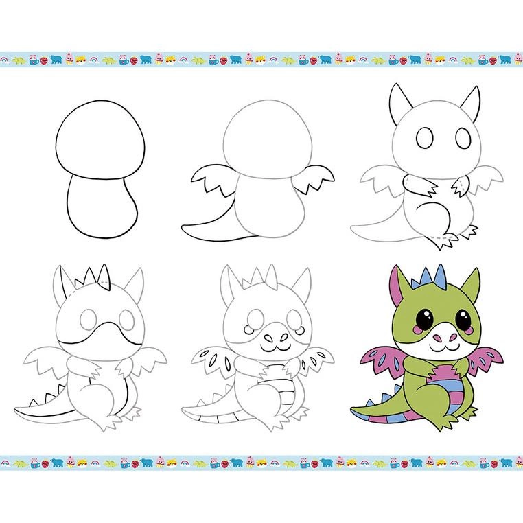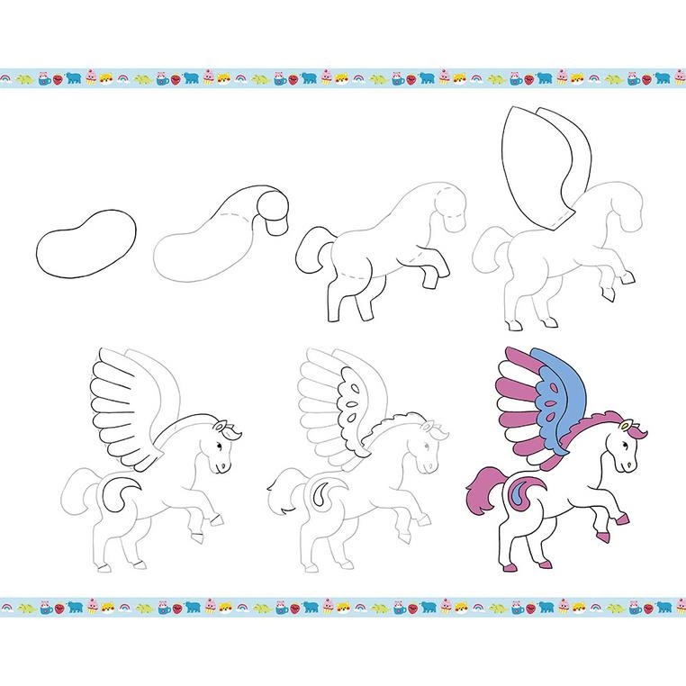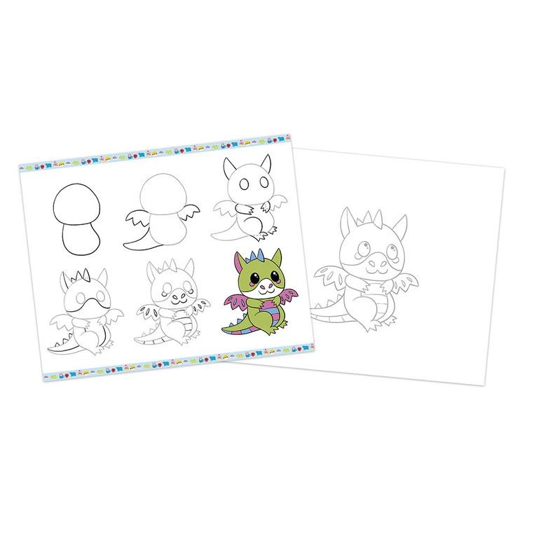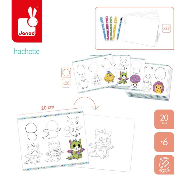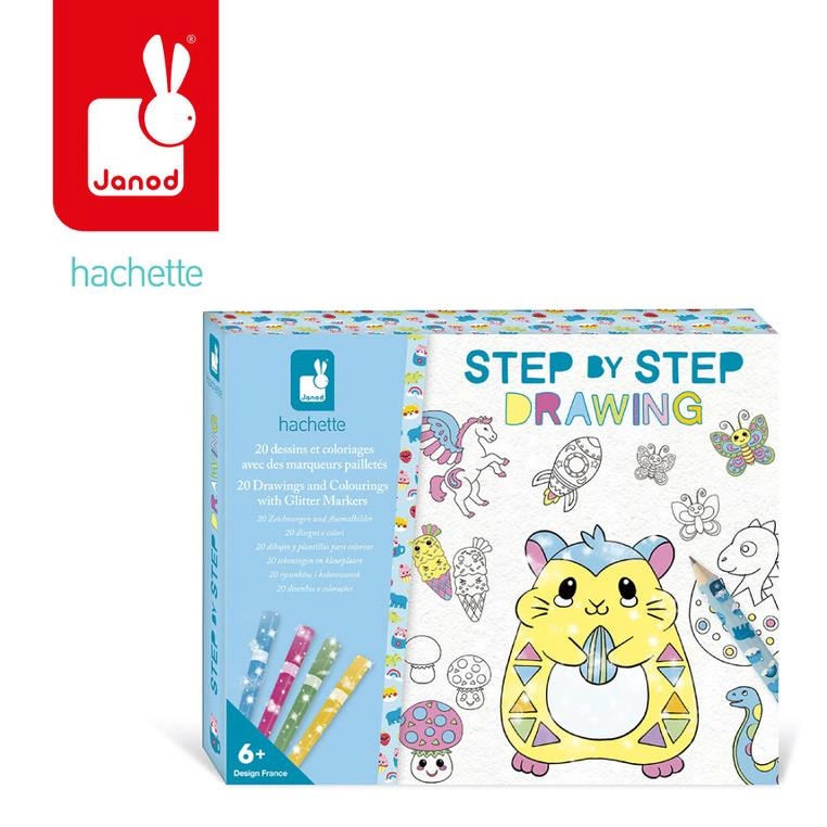 Zestaw kreatywny do nauki rysownia krok po kroku francuskiej marki JANOD. Zawiera 20 kart ze wzorami do odwzorowania krok po kroku, 25 pustych kartek, ołówek z gumką oraz 4 brokatowe markery (różowy, niebieski, zielony i złoty). Dziecko uczy się, uzupełniając kolejne rysunki i kolorując je. Następnie może wielokrotnie odtwarzać je na załączonych czystych kartkach. Rysunki do odtworzenia przedstawiają uwielbiane przez dzieci zwierzęta, dinozaury czy rzeczy w stylu kawaii. Nauka rysowania to długie godziny angażującej i jednocześnie uspokajającej, wyciszającej zabawy, a gotowe obrazki staną się wspaniałym elementem dekoracyjnym dziecięcego pokoju.