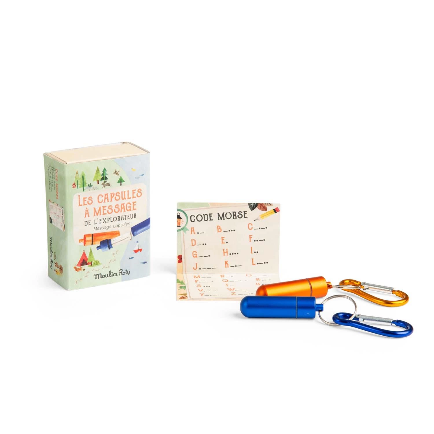 Przekazuj tajne wiadomości za pomocą metalowych kapsuł z kolekcji Le Jardin du Moulin. Zestaw zawiera alfabet Morse'a i dwie hermetyczne kapsułki z wiadomościami. Można zabrać je ze sobą wszędzie, dzięki dołączonym karabińczykom.