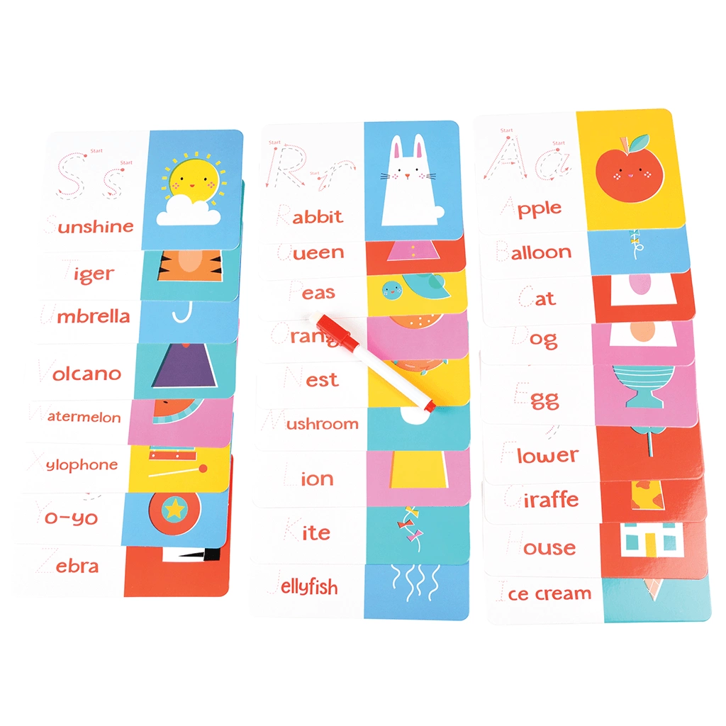 Edukacyjny zestaw kart ze zmazywalnym pisakiem do nauki pisania liter i poznawania angielskich słówek.