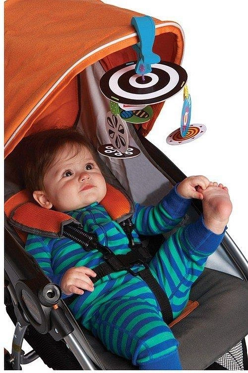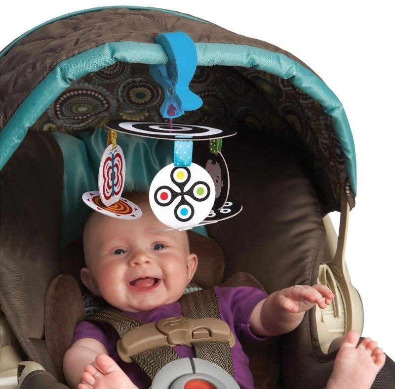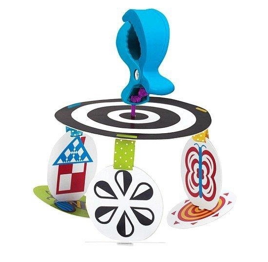 Karuzela nad łóżeczko, do wózka z serii Wimmer-Ferguson marki Manhattan Toy łatwa do zamocowania, wyposażona w sześć kart zawierających obrazy o wysokim kontraście, stymulujące do obserwacji zainteresują dziecko podczas spacerów.