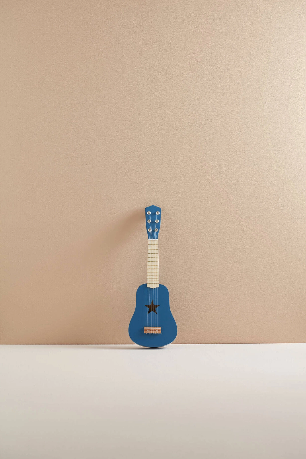 Drewniana gitara zabawkowa z wycięciem w kształcie gwiazdy.