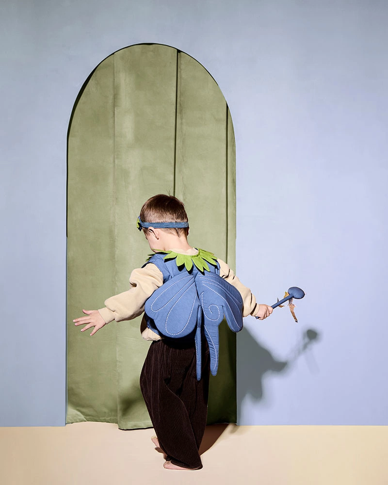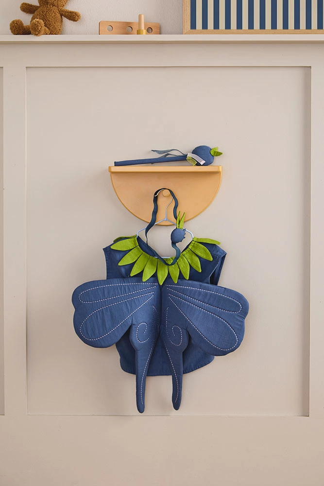 Przebranie Jagodowej Wróżki przenosi dzieci w świat wyobraźni inspirowany szwedzkim lasem i słodkimi jagodami. Miękki, granatowy kubraczek z zaokrąglonym przodem i kołnierzykiem ozdobionym liśćmi tworzy bazę kostiumu. Na plecach przymocowane są miękkie, niebieskie skrzydełka, które dodają całości lekkości i bajkowego charakteru. W zestawie znajduje się również opaska z materiałową jagodą oraz różdżka zwieńczona jagodą, dzięki której dzieci mogą rzucać „jagodowe zaklęcia” i wymyślać własne baśniowe przygody. Kostium zapinany na rzepy – łatwy do zakładania i zdejmowania.
