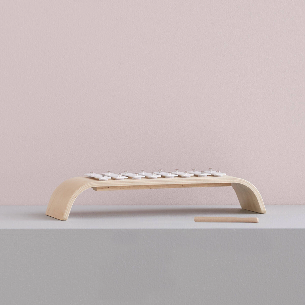 - Zabawkowy ksylofon ze sklejki bejcowanej naturalnie z białymi płytkami.