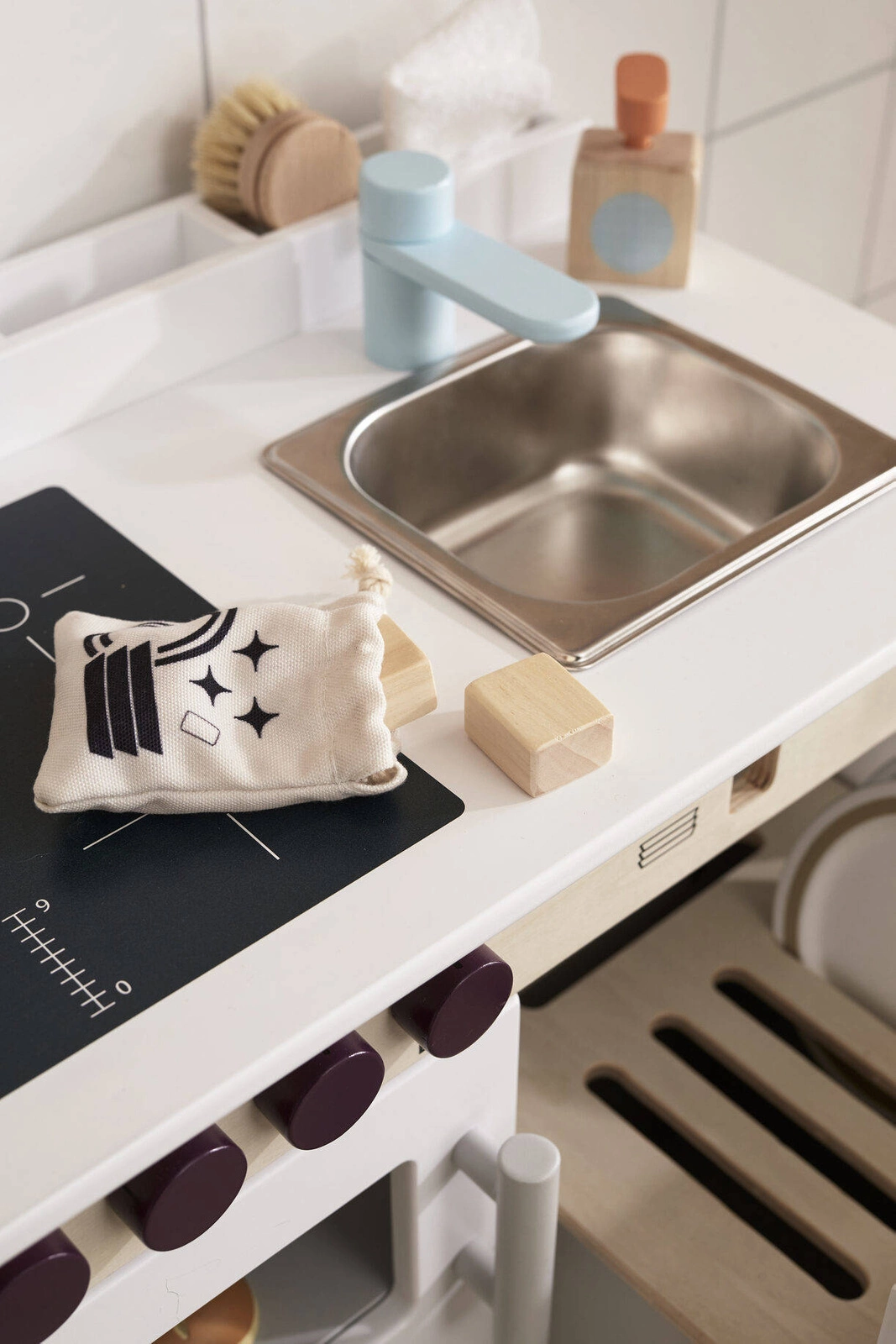 Bez obaw. Ta współczesna kuchnia jest wykonana z drewna z certyfikatem FSC i wyposażona w zmywarkę do naczyń, piekarnik, zlewozmywak, półki i zintegrowany okap kuchenny. Umieść kilka talerzy i sztućców na podstawce w zmywarce, a tabletkę włóż do otworu z przodu. Przekręć klikające pokrętło i gotowe. Jest też szczoteczka do mycia naczyń i płyn do usuwania wszelkich trudnych plam. Z boku znajdziesz trzy wieszaki, na których możesz zawiesić ściereczkę do naczyń. Zmywarka i przestrzeń pod piekarnikiem po zakończonej zabawie mogą stać się praktycznym schowkiem. Zestaw zawiera: kuchenkę i zmywarkę, ręcznik, szczoteczkę do naczyń, blachę do pieczenia, dozownik mydła w płynie z pompką i dwie tabletki do zmywarki w torbie do przechowywania.
