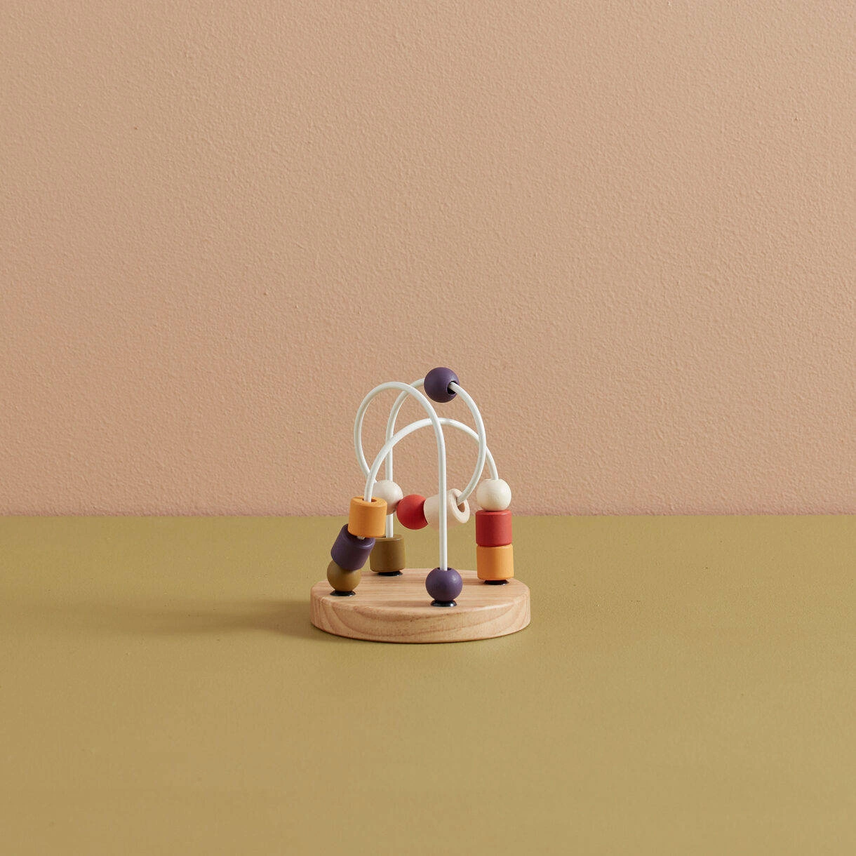 Składa się z trzech torów i 15 drewnianych koralików w różnych kolorach. Labirynty z koralików pomagają dziecku doskonalić koordynację wzrokowo-ruchową i rozwijać zdolności motoryczne, a jednocześnie są zabawką, która sprawia wiele radości.