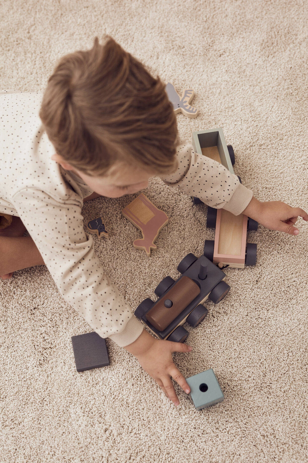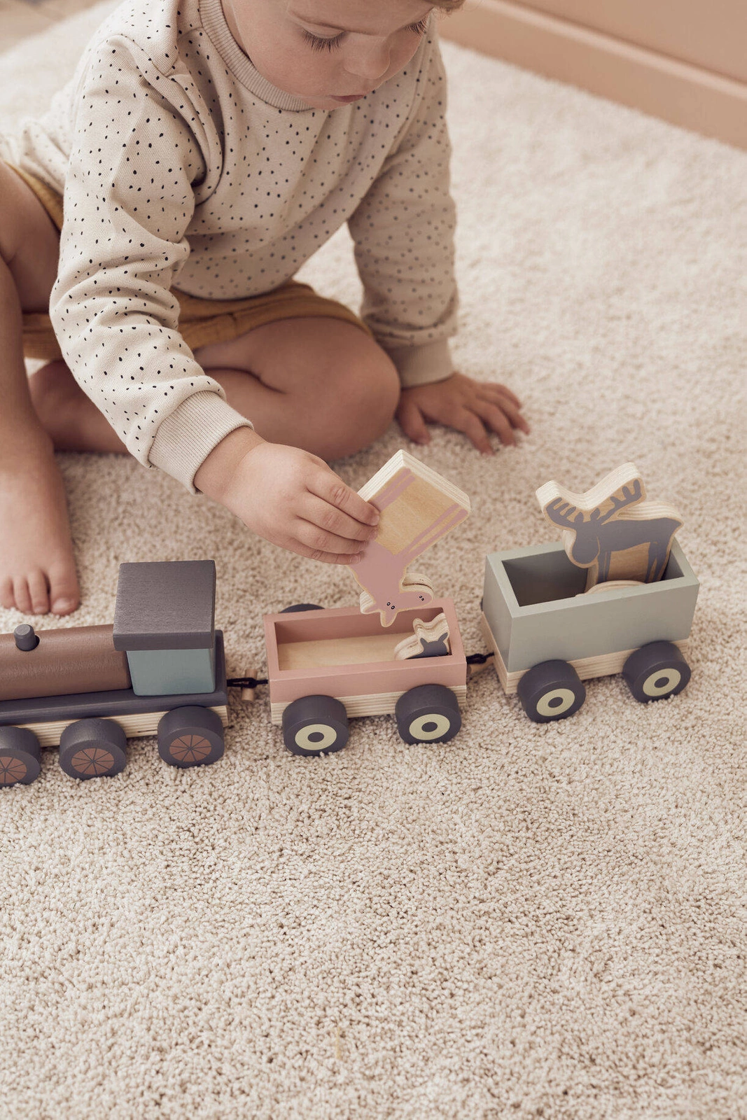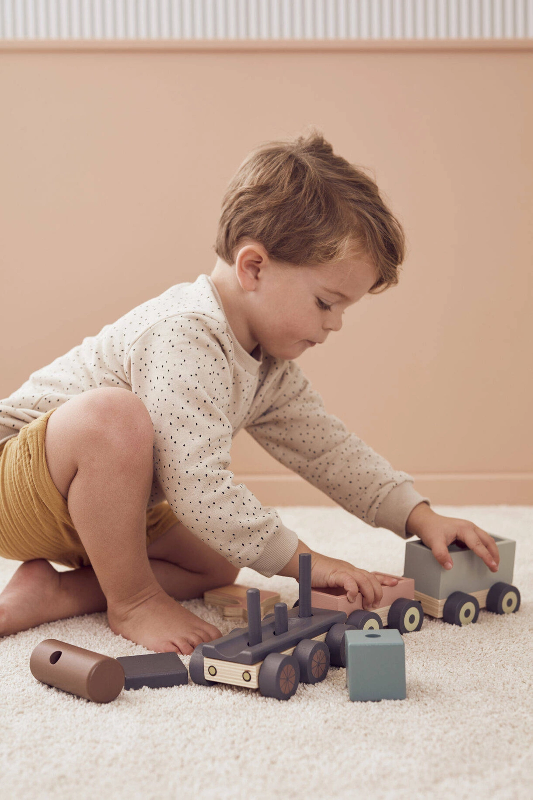 - Drewniany pociąg z lokomotywą, zbudowaną z klocków, oraz dwoma wagonami, które można łatwo łączyć i rozłączać.