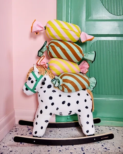 Pewnego słonecznego dnia Pippi Długoskarpetka wkroczyła do miasta z kieszeniami pełnymi złotych monet. Jej pierwszym przystankiem był sklep ze słodyczami, który opuściła z osiemnastoma kilogramami cukierków. Ta wyjątkowa poduszka czerpie swój kształt właśnie z tamtych słodkości – przypomina cukierek w papierku, z uroczymi, związanymi końcami.