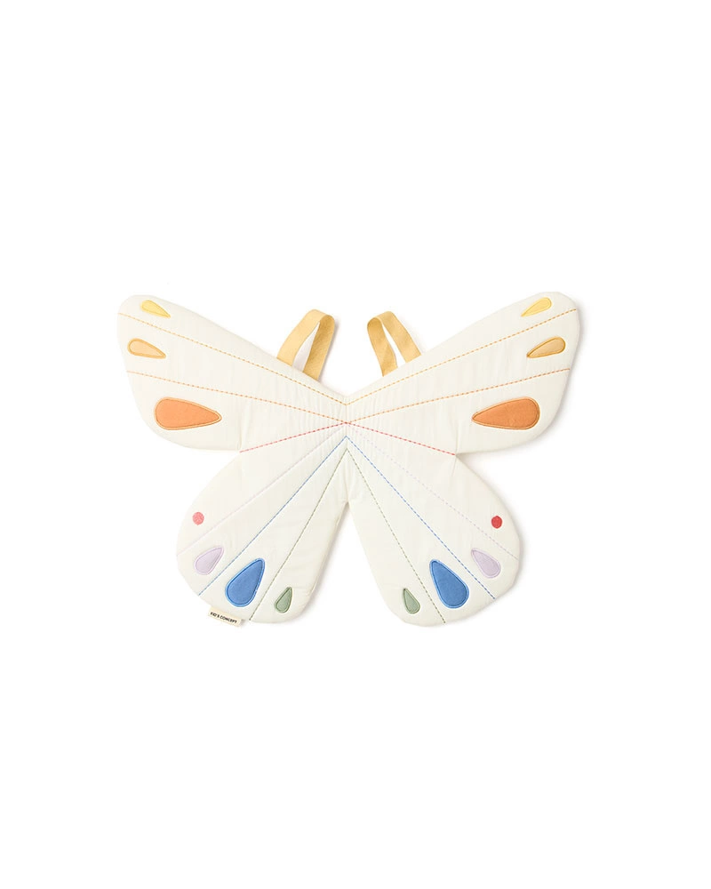 - Skrzydła motyla z bawełny organicznej w odcieniach zieleni i wielobarwnych haftów. Elastyczne szelki pozwalają dziecku łatwo je założyć i rozpocząć zabawę.