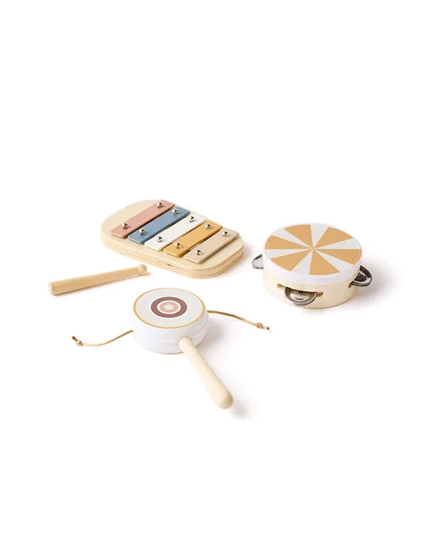 - Zróbmy hałas! Kid's Concept - Zestaw muzyczny składa się z mini bębenka, tamburyna, cymbałek z pałeczką w rozmiarze odpowiednim dla małych rączek dziecka.