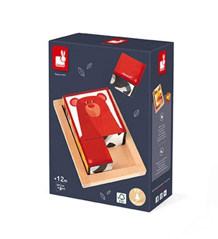 Zestaw drewnianych klocków-puzzli francuskiej marki JANOD. Składa się z 6 drewnianych klocków i pudełka-podstawki, na którym się je układa. Komplet umożliwia ułożenie 6 różnych obrazków z postaciami zwierząt: niedźwiedzia, sowy, lisa, królika, szopa i łosia. To doskonała układanka dla małych dzieci na rozpoczęcie przygody z puzzlami. Klocki zaprojektowano we Francji. Zapakowane są w estetyczne, kartonowe pudełko. Idealnie nadają się na prezent.