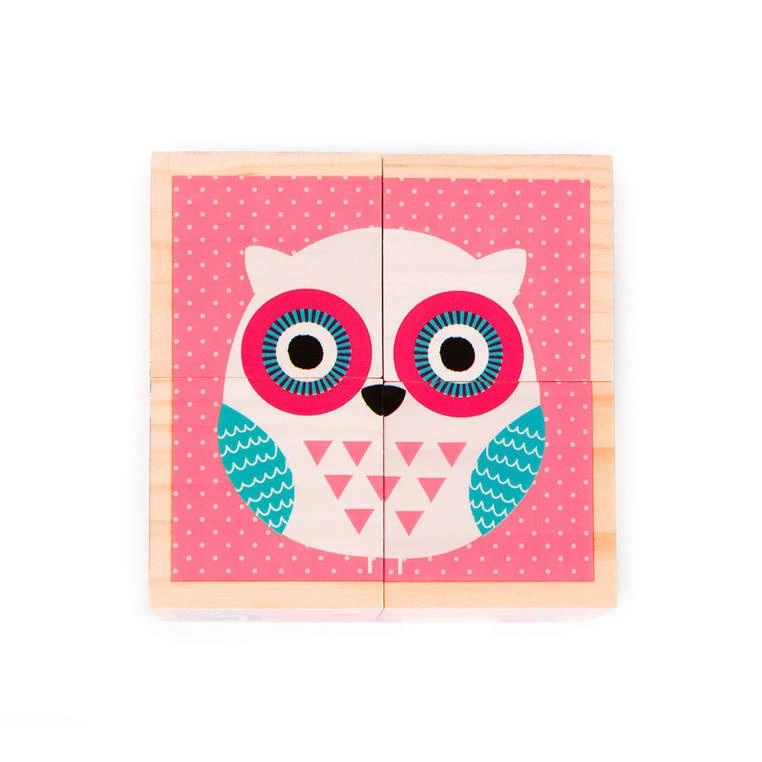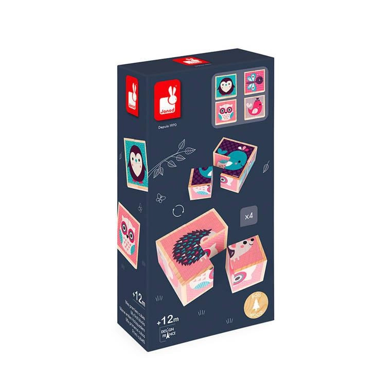 Zestaw składa się z 4 drewnianych klocków. Komplet umożliwia ułożenie 6 różnych obrazków z postaciami zwierząt: jeża, pingwina, wieloryba, sowy, ptaka i ważki. To doskonała układanka dla małych dzieci na rozpoczęcie przygody z puzzlami. Klocki zaprojektowano we Francji.