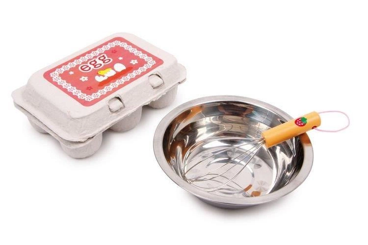 Super zestaw do zabawy w kuchnie dla dzieci. 6 drewnianych jajek w tekturowym pojemniku. W trzech z nich można oddzielić żółtko od białka. W zestawie także metalowa miseczka (średnica: 12 cm) i trzepaczka z drewnianą rączką. Kuchnia dla dzieci może zostać wzbogacona o nowy deser "kogel-mogel" :)