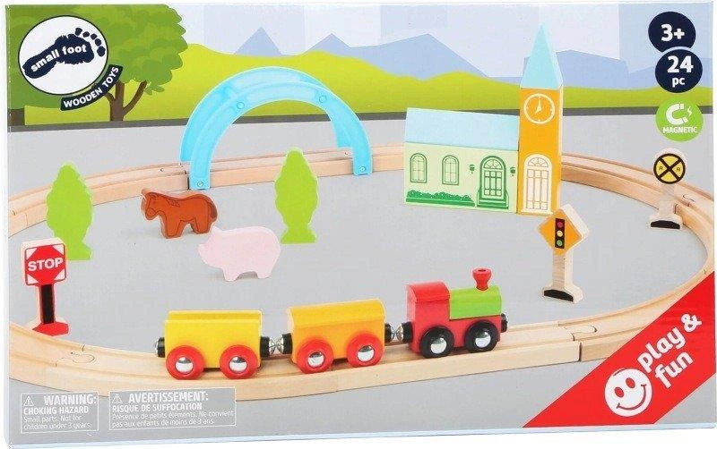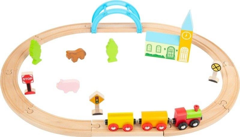 Drewniany zestaw z akcesoriami Wieś i okolica Small Foot to komplet zawierający 24 elementy. W ich skład wchodzą delikatnie zakrzywione tory tworzące owalną trasę oraz dodatki pomagające nadać całości wyjątkowego charakteru. Kolorowa lokomotywa wraz z dwoma wagonikami może przemierzać tą piękną scenerię. Zawiadujące nią maluchy mogą bez ograniczeń korzystać ze swojej kreatywności oraz wyobraźni.