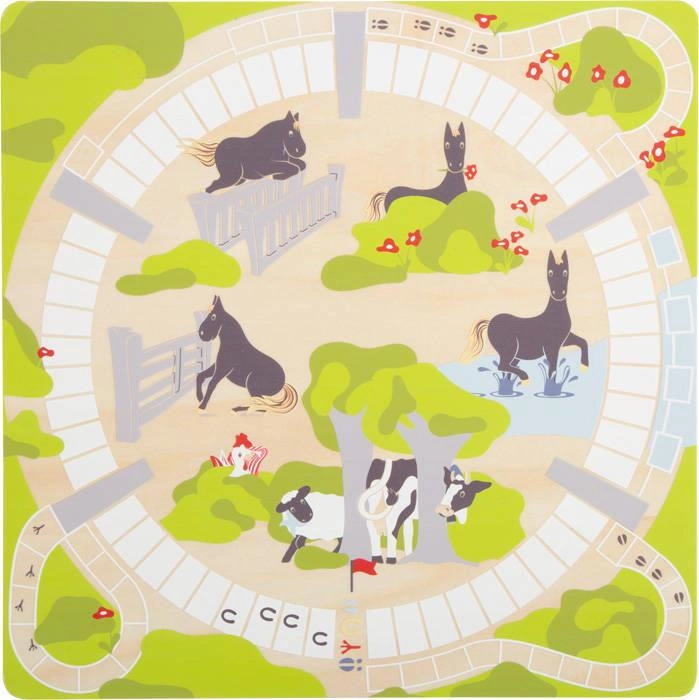 Zestaw gier planszowych 4 Friends Small Foot to wspaniała kolekcja, która spodoba się wszystkim miłośnikom planszówek. Składa się z gry drabinkowej, Ludo, układania zwierząt oraz wyścigów konnych w formie przyjaznej dzieciom. Wykonane z drewna wysokiej jakości, dwie, dwustronne plansze z motywem farmy to gwarancja wspaniałej zabawy na długi czas. Zaprzyjaźnione zwierzątka, takie jak: koń, krowa, owca i kura są charakterystyczną cechą kolekcji 4 Friends Small Foot, a a magnesy znajdujące się na każdym z nich umożliwiają układanie zwierząt w stos. Gry planszowe rozwijają wyobraźnię, pamięć i koncentrację, a także logiczne myślenie zapewniając przy tym dużo pozytywnych wrażeń dla całej rodziny.