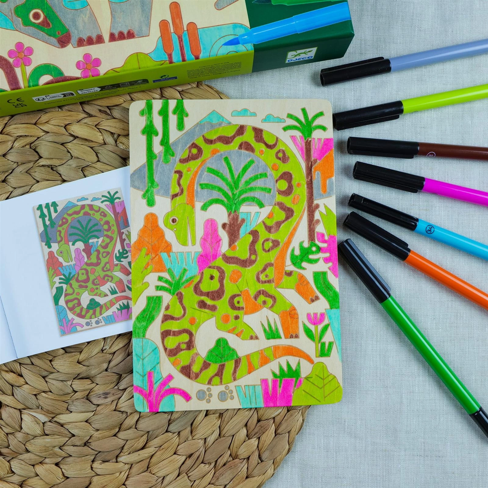 Zestaw zawiera 3 drewniane podkładki przedstawiające świat dinozaurów oraz 7 kolorowych mazaków wysokiej jakości z dwiema końcówkami: cienką zaokrągloną oraz grubszą szpiczastą. Z pomocą załączonej instrukcji należy krok po kroku zamalować wyznaczone przestrzenie na odpowiednie kolory. Wyżłobione kontury zapobiegają mieszaniu się barw i wychodzeniu poza linie. Kolory rysunku nie tracą na intensywności nawet po wyschnięciu. Drewniane tabliczki posiadają zaokrąglone rogi dla bezpieczniejszego użytkowania.