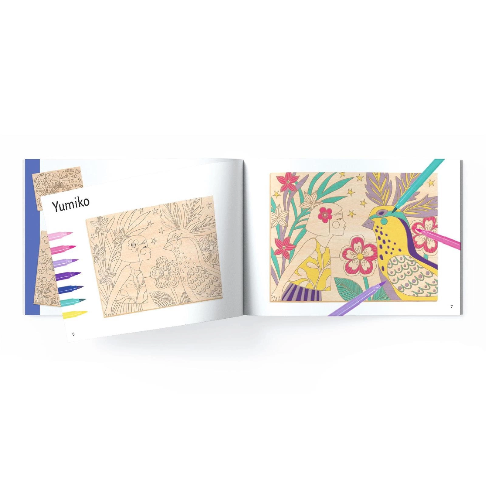 Zestaw zawiera 3 drewniane podkładki przedstawiające urocze dziewczynki na tle wiosennego krajobrazu oraz 7 kolorowych mazaków wysokiej jakości z dwiema końcówkami: cienką zaokrągloną oraz grubszą szpiczastą. Z pomocą załączonej instrukcji należy krok po kroku zamalować wyznaczone przestrzenie na odpowiednie kolory. Wyżłobione kontury zapobiegają mieszaniu się barw i wychodzeniu poza linie. Kolory rysunku nie tracą na intensywności nawet po wyschnięciu. Drewniane tabliczki posiadają zaokrąglone rogi dla bezpieczniejszego użytkowania.