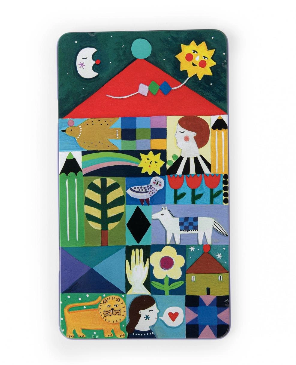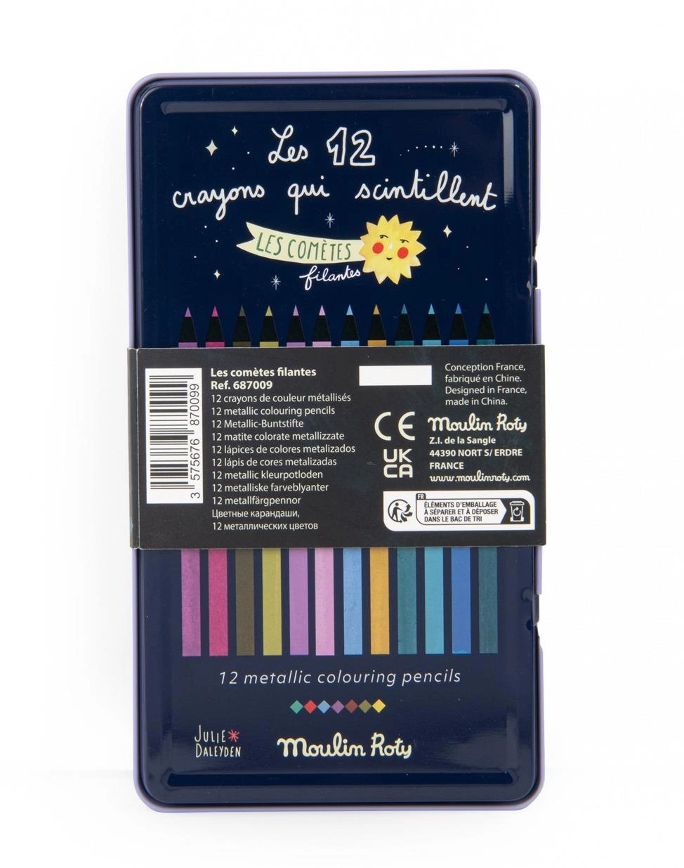 Zestaw 12 kredek o metalicznych kolorach z kolekcji Les comètes filantes. Zamknięte w pięknie ilustrowane, praktyczne metalowe pudełko. Autorką grafik jest twórczyni kolekcji Julie Daleyden. Kredki o nietypowych odcieniach sprawdzą się idealnie do malowania kosmicznych pejzaży.