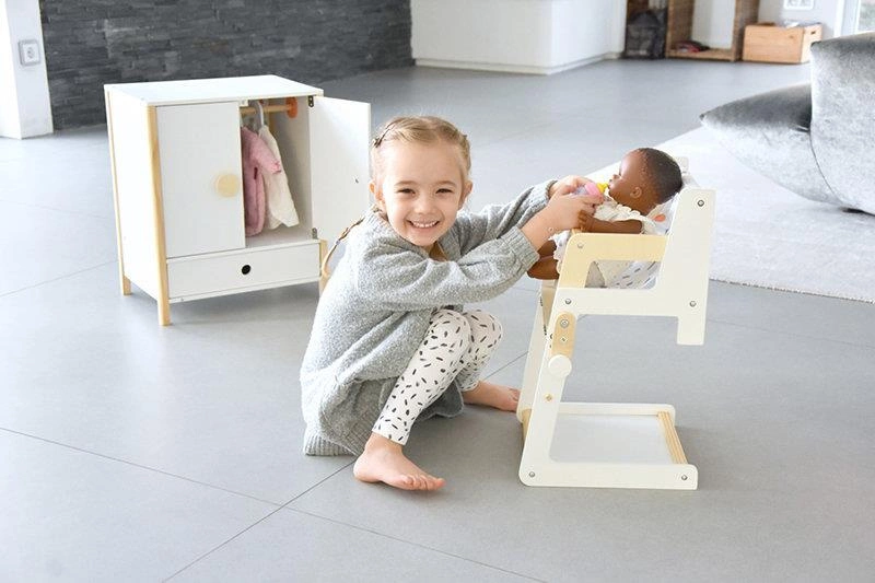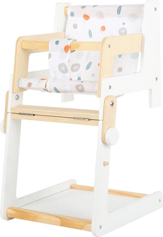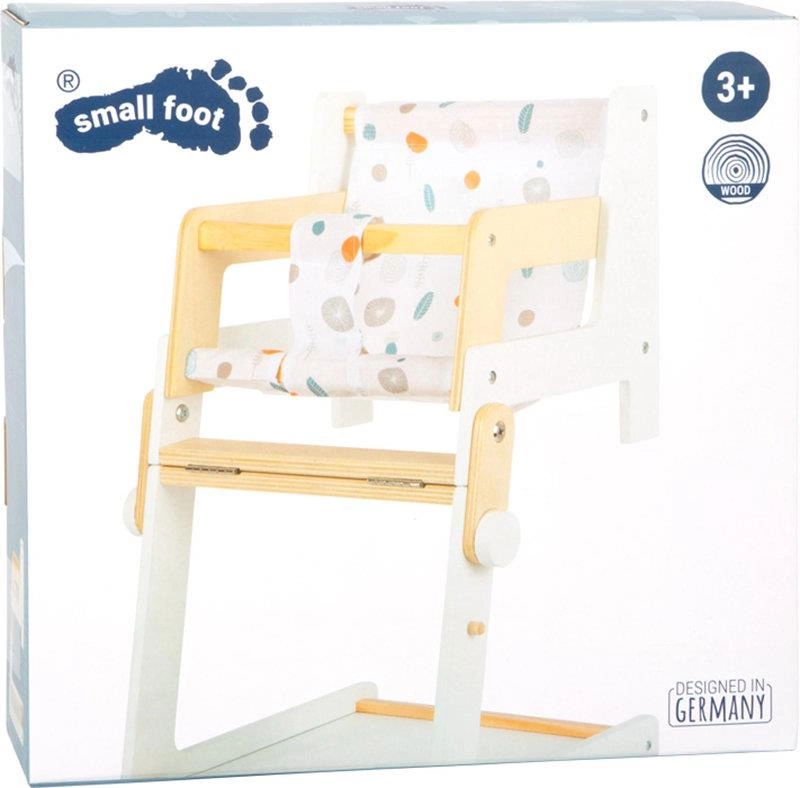 Krzesełko dla lelek "Małe Groszki" Small Foot to wymarzone siedzisko do karmienia! To wielofunkcyjne krzesełko dla lalek robi wrażenie zarówno na starszych, jak i młodszych „rodzicach” lalek. Wystarczy kilka ruchów ręką, aby to wysokie krzesełko można było przekształcić w zestaw krzesła i stołu. Lalki nie znajdą lepszego miejsca do jedzenia niż ten fotelik! Dzięki subtelnemu wzornictwu ten nowoczesny mebel będzie dobrze pasował do wystroju każdego pokoju dziecięcego. To krzesełko imponuje klientom widocznymi elementami z litego drewna i estetycznie wykończonym zaokrąglonym krawędziom.