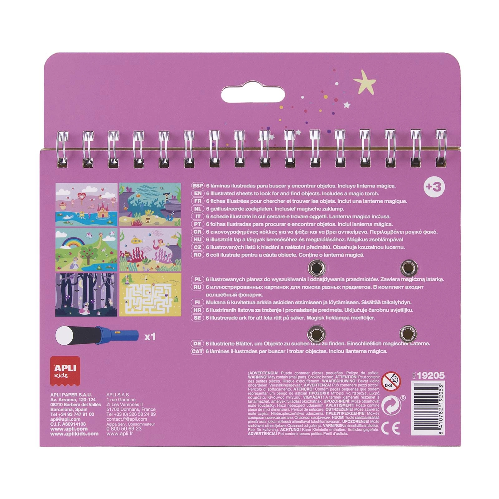 Zestaw zawiera 6 plansz na spirali do wyszukiwania i odnajdywania przedmiotów na obrazkach z motywem księżniczek i syrenek. Każda strona odkryje przed dzieckiem sekrety magicznego świata, a kolorowa grafika zachęci dziecko do zabawy. Dziecko za pomocą latarki odnajduję ukryte przedmioty na planszach. Dzięki kompaktowym rozmiarom, książeczka sprawdzi się podczas podróży, zapewniając rozrywkę i edukację w jednym! Pobudzaj ciekawość, poprawia spostrzegawczość, rozwija zdolności motoryczne i pobudza wyobraźnię.