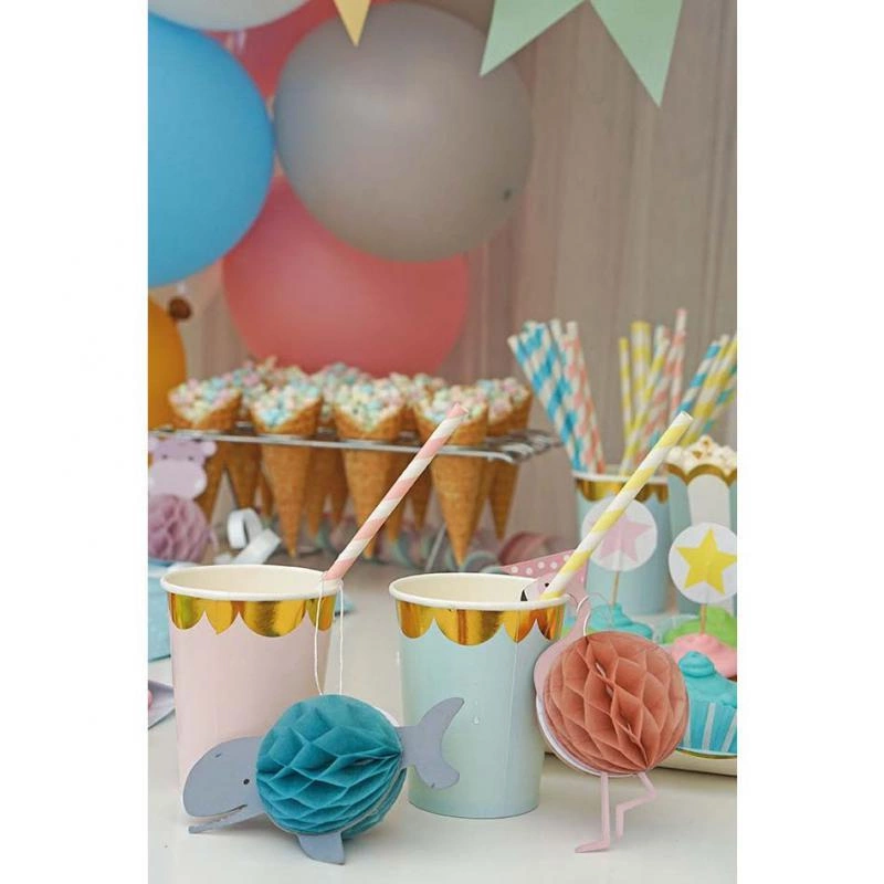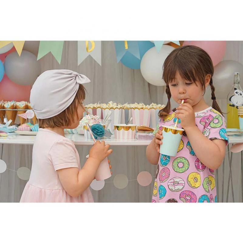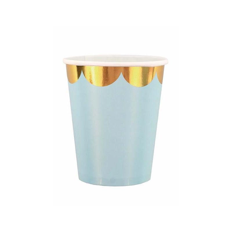 Zestaw ośmiu uroczych kubeczków w kolorze pastelowo niebieskim, z uroczym motywem złotym - idealne do nakrycia urodzinowego stołu.