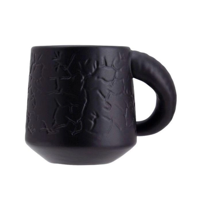 Ogniste logo pokrywa jedną stronę kubka, a uchwyt w kształcie rogu jest podwinięty do kubka.