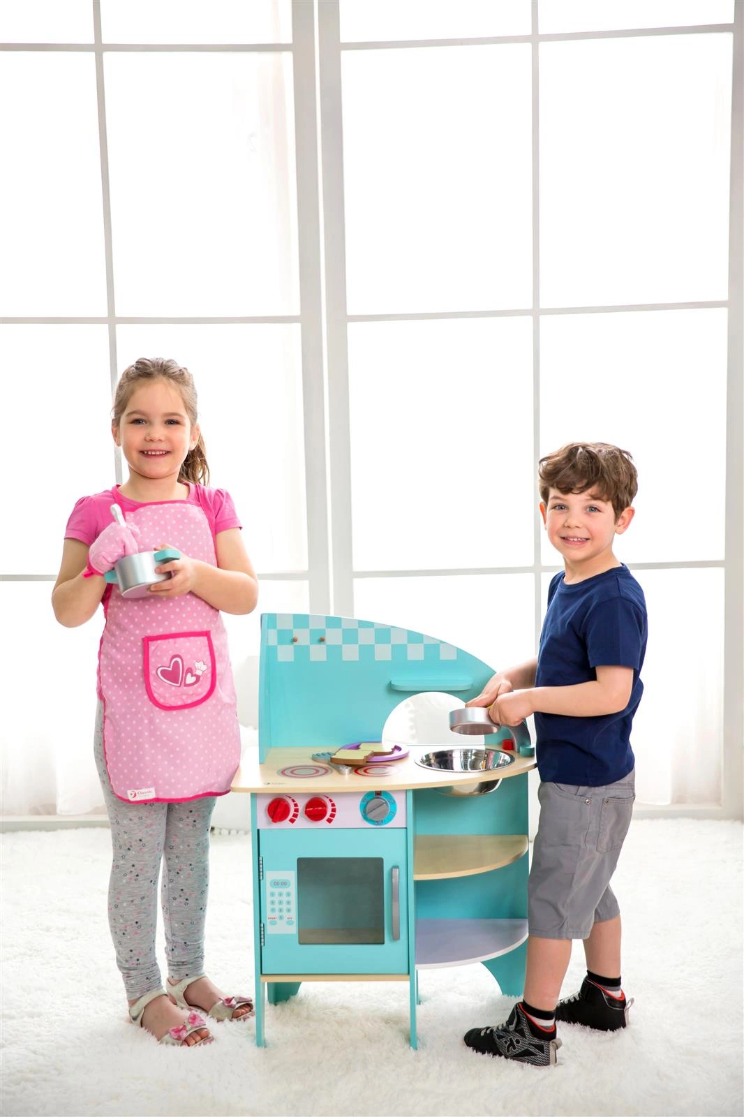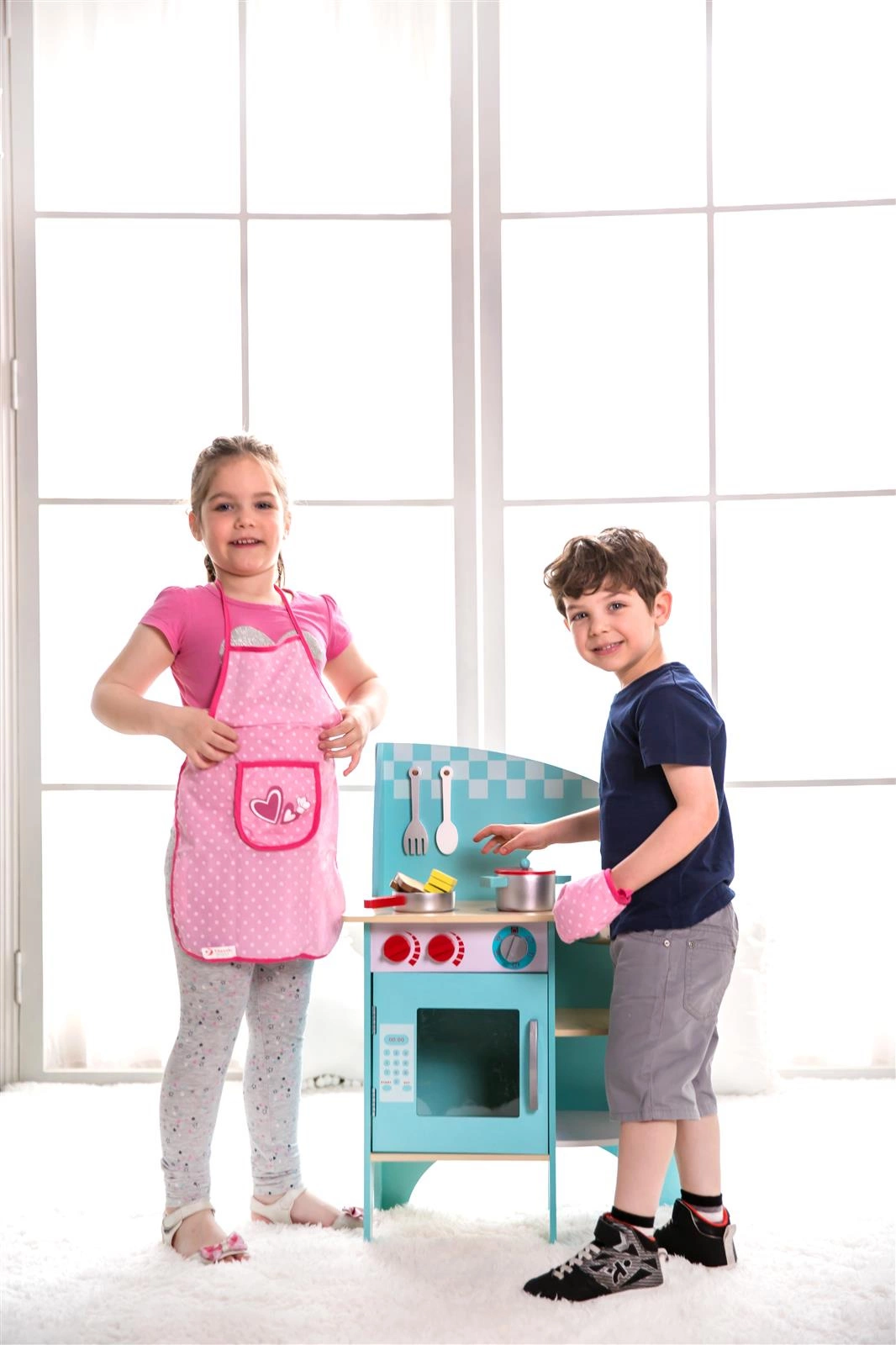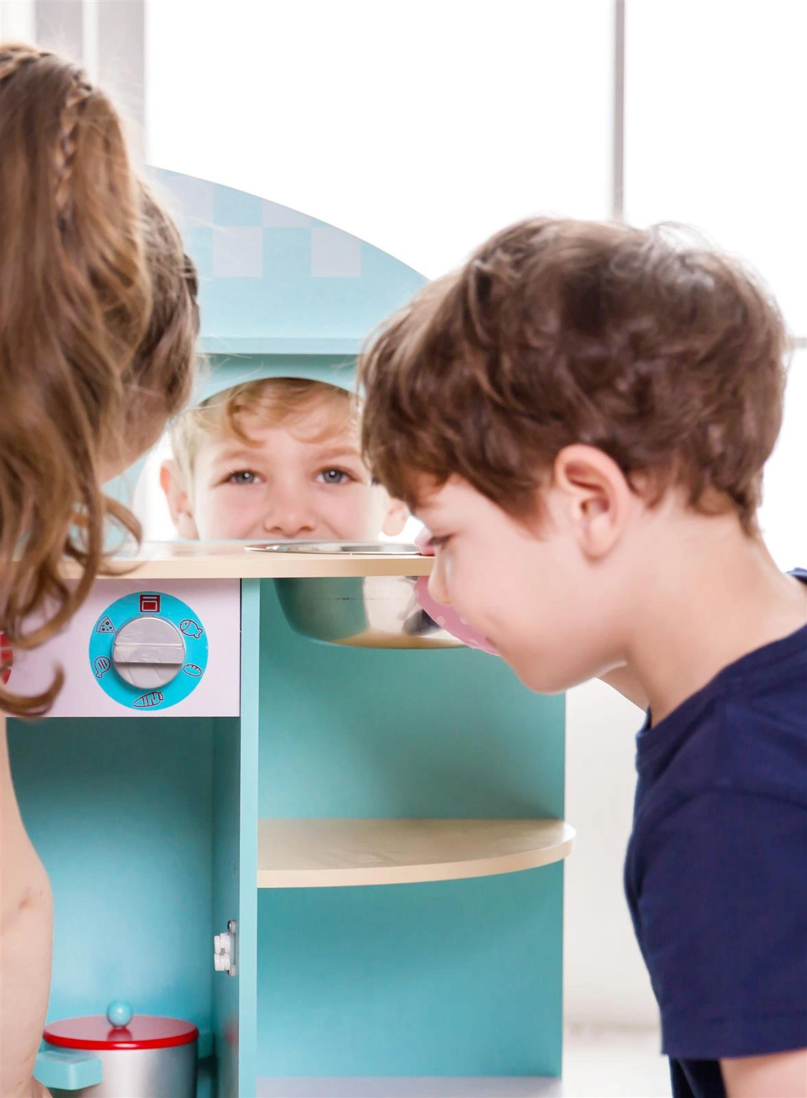 Niebieska kuchnia dla dzieci to wykonana z drewna zabawka, która świetnie sprawdzi się jako pomoc w rozwijaniu umiejętności społecznych dziecka, oraz jego zdolności obserwacji. Może naśladować poczynania rodziców w prawdziwej kuchni i przenosić wszystkie czynności do swojej kuchni zabawkowej.
