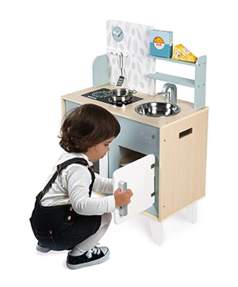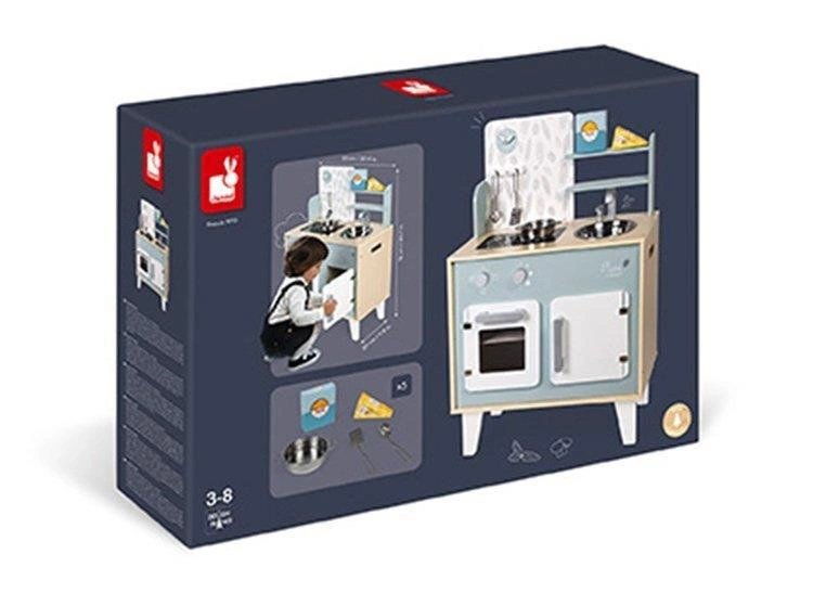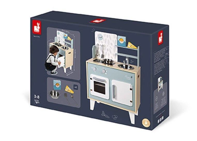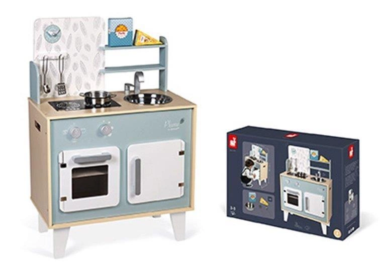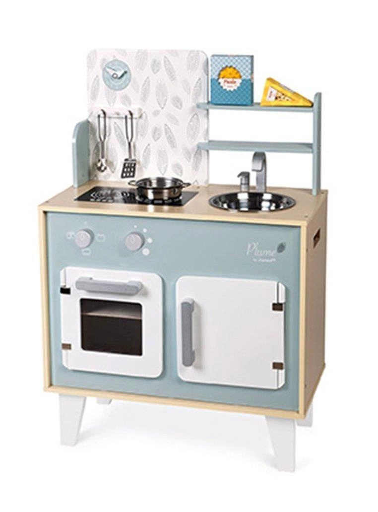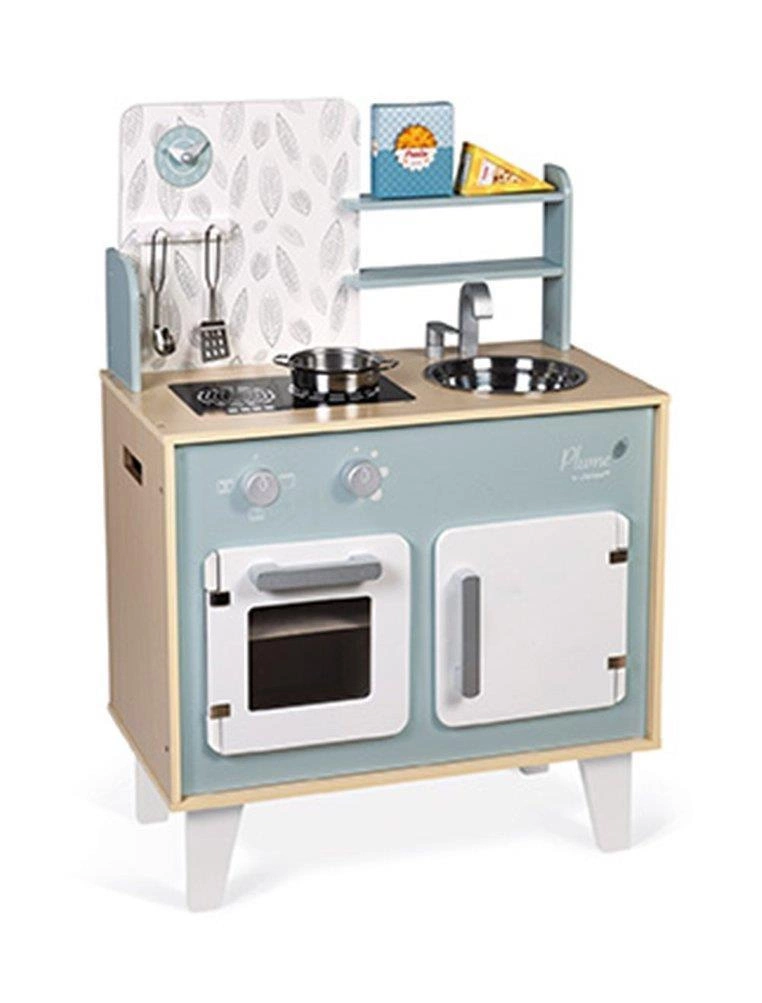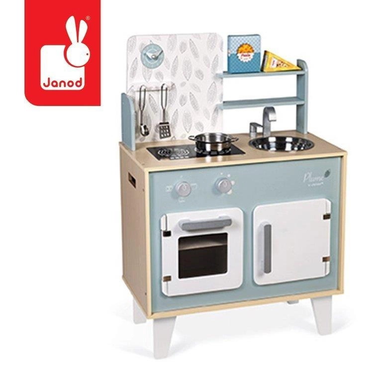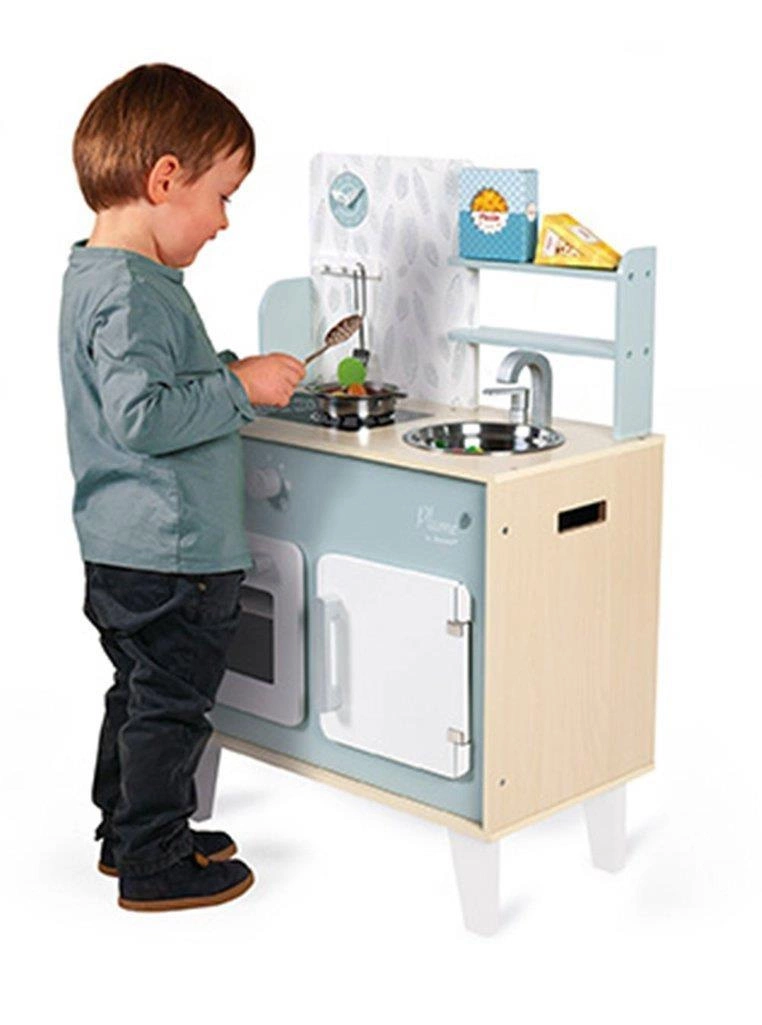 Drewniana kuchnia Plume francuskiej marki JANOD sprawi mnóstwo radości każdemu dziecku. Pozwoli mu ona bezpiecznie uczestniczyć w codziennych czynnościach i rozwijać pasję gotowania. Urocza kuchenna zabudowa na nóżkach utrzymana jest w kolorach jasnego drewna, błękitu, bieli i szarości. Posiada okrągły, metalowy zlew, dwa „elektryczne” palniki, otwierany piekarnik z dwoma pokrętłami, dolną szafkę z drzwiczkami, dwie otwarte górne półki, a na tylnej ścianie (białej z oryginalnym wzorem w szare pióra) – wieszak z 3 haczykami i zegar. Do zestawu dołączone są ponadto akcesoria: metalowy garnek, łyżka do makaronu i szpatułka oraz 2 kartoniki-produkty spożywcze (makaron i ser). W bocznych ściankach mebel ma wygodne otwory do przenoszenia. Dzięki sporym rozmiarom i wielu akcesoriom zabawką może się bawić jednocześnie więcej niż jedno dziecko.
