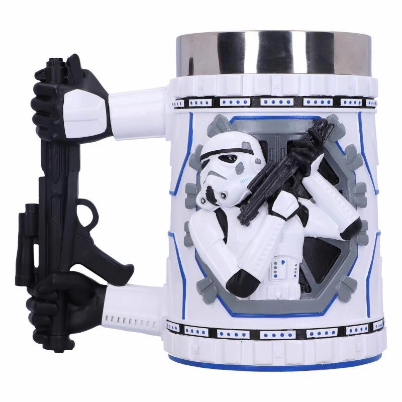 Z przodu i z tyłu kufla widzimy Szturmowca przygotowanego do walki, z uniesionym w powietrzu pistoletem blasterowym, który stoi opanowany, czujny i gotowy, by chybić swój następny cel.