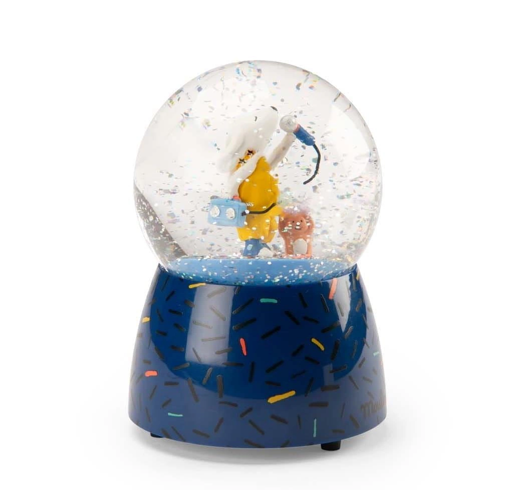 Piękna kula śnieżna w granatowym kolorze z pozytywką z serii Puce & Pilou od Moulin Roty, oczaruje każde dziecko. W kuli pod deszczem konfetti znajduje się piesek bohater kolekcji w żółtych ogrodniczkach, który daje swój niepowtarzalny koncert. Zabawka będzie piękną ozdobą dziecięcego pokoju. Pozytywkę wprawia się w ruch poprzez nakręcenie korbki znajdującej się w podstawie kuli.