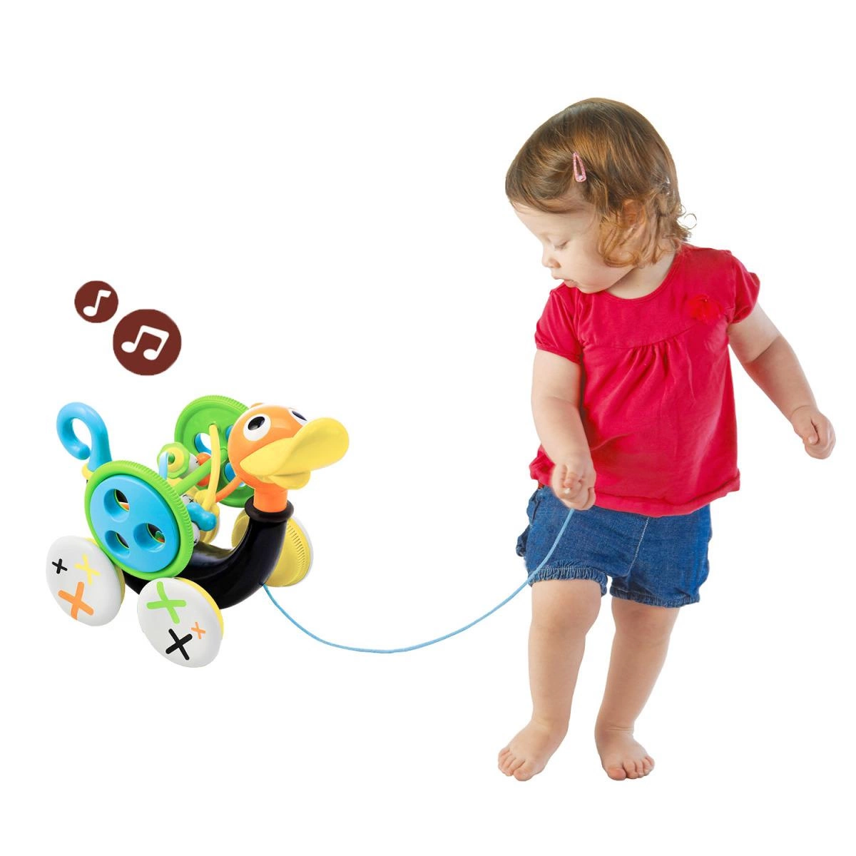 Kwacząca kaczuszka na sznurku to urocza zabawka 2w1, która zachęca malucha do chodzenia, odkrywania i rozwijania kluczowych umiejętności – wszystko to w rytmie radosnego gwizdania i śpiewu! Opakowanie z okienkiem – idealne na prezent lub do ekspozycji. Gdy dziecko ciągnie kaczkę za sznurek, ta gwiżdże i śpiewa, a kolorowy walec z koralikami obraca się na jej grzbiecie. Po zatrzymaniu – dźwięk cichnie, ucząc związku przyczyna–skutek. Walec można zdjąć i bawić się nim osobno. Po chwili bezczynności kaczka zaczyna nawoływać dziecko – dźwięki pojawiają się coraz rzadziej i po 10 minutach cichną całkowicie. Dlaczego ją pokochasz zachęca do samodzielnego chodzenia – radosne dźwięki w nagrodę, rozwija małą i dużą motorykę, uczy związku przyczyna–skutek, stymuluje zmysły – muzyka, kolory, ruch, dźwięk, buduje pewność siebie – dziecko kontroluje tempo i interakcję, rozwija emocje i więzi – znajoma, zabawna twarz kaczuszki, zabawka rośnie z dzieckiem – 2w1: chodzik i walec z koralikami, tryb nawoływania – zachęca do dalszej zabawy, muzyka dopasowana do małych dzieci. Szczegóły Wiek: 12–36 miesięcy Zasilanie: 3 x AA (brak w zestawie) Funkcje: przycisk on/off (tryb cichy), dźwięki, zdejmowany walec z koralikami Bezpieczeństwo: elementy bezpieczne dla dzieci, także w okresie ząbkowania.