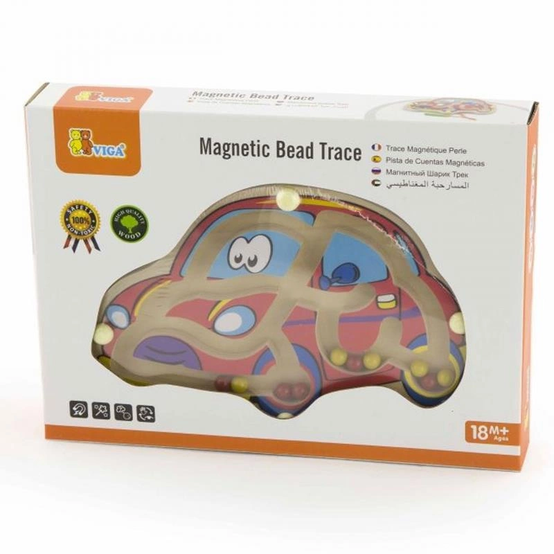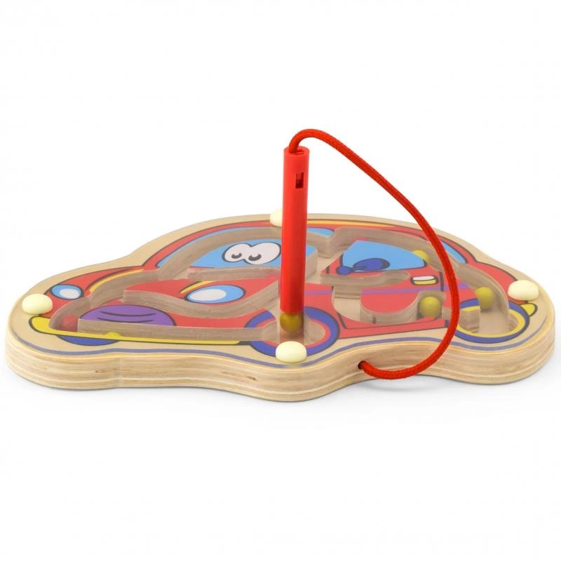 Magnetyczny labirynt Samochodzik to zabawka, która będzie wpływać zarówno na rozwój koordynacji ręka-oko, ale i na ćwiczenie sprawności manualnej dziecka. Pałeczka przymocowana jest na sznureczku, co zapobiegnie jej zgubieniu.