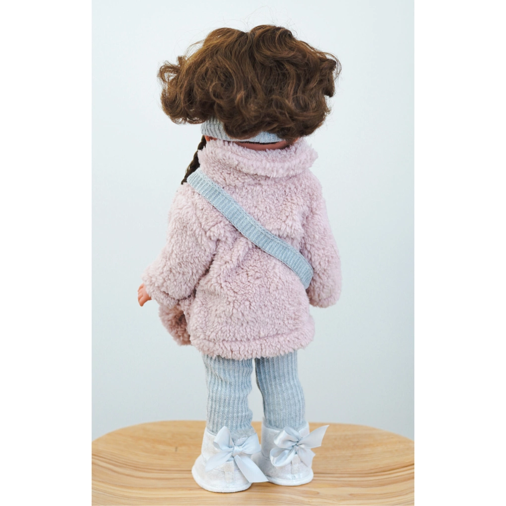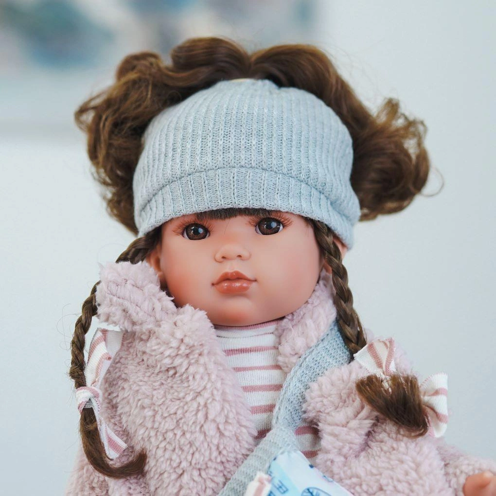 Filigranowa dziewczynka 28120 uzupełnia kolekcję lalek hiszpańskich marki Antonio Juan. Lalka o imieniu Bella ma 45 cm wysokości i po odpowiednim ułożeniu nóżek stoi samodzielnie. Lalka przypomina nieco starszą dziewczynkę z długimi włosami przeznaczoną do czesania. Bella ma śliczne, gęste brązowe włoski z dwoma warkoczykami, które ozdobiono białymi gumeczkami w różowe paseczki. Warkocze można rozpuścić i rozczesać. Najmłodsze pociechy mogą zadbać o stylizację włosów lub upiąć je w nową fryzurę, aby nadać zupełnie inny wygląd swojej ulubionej lali. Dodatkową fryzurę zdobi ciepła, prążkowana czapeczka. Dodatek na głowę za pewne przyda się podczas spacerów w chłodniejsze dnia co by urocza Bella nie zmarzła.