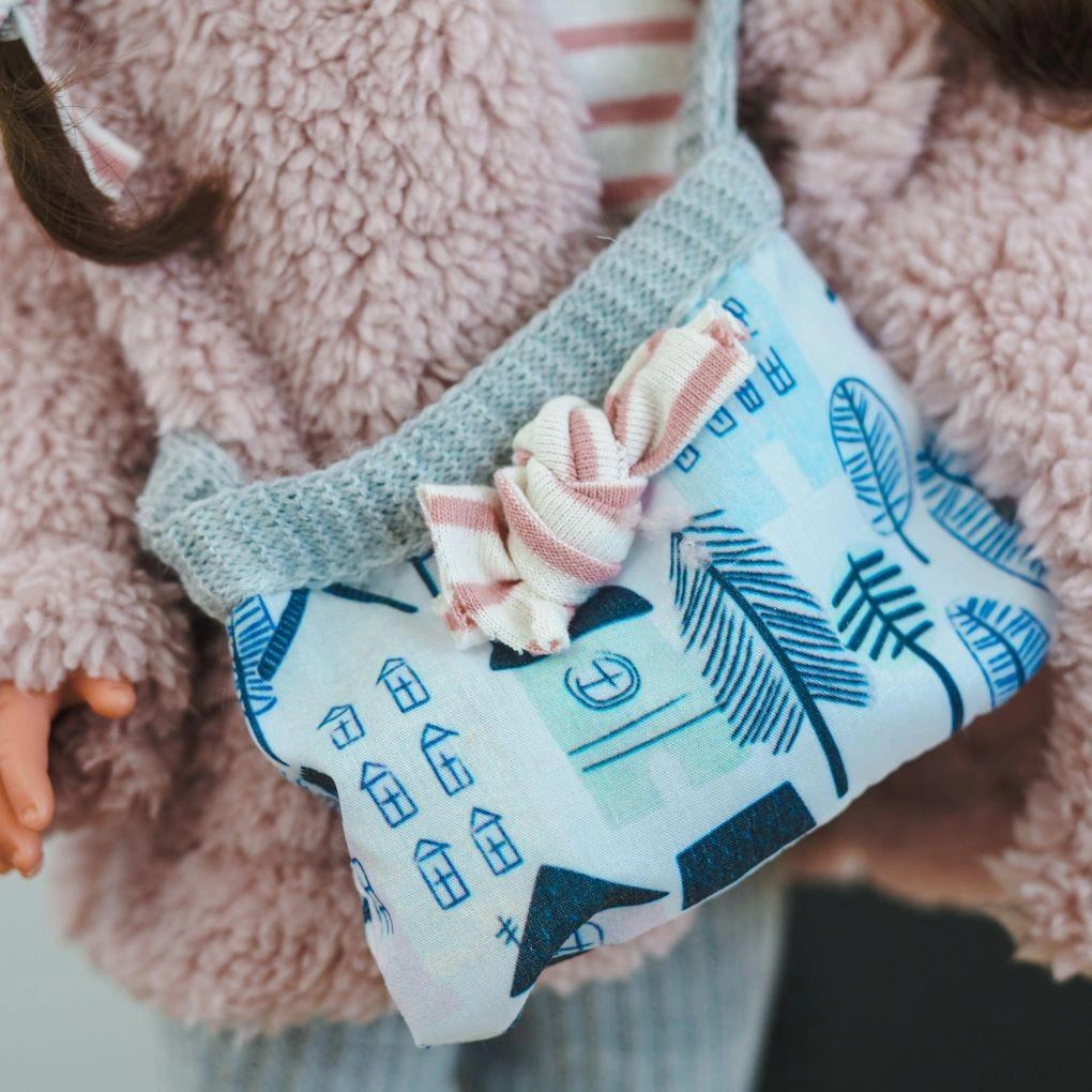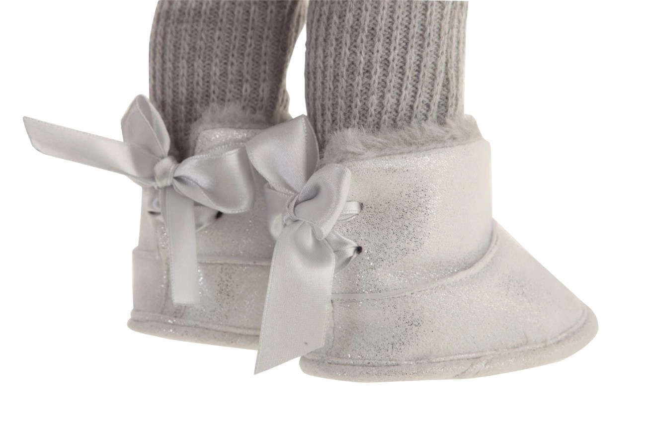 Bella ubrana jest w przepiękną zimową stylizację, którą niejedna dziewczynka chciałaby mieć w swojej szafie. Lalka ma na sobie sweterek w paski na długi rękaw oraz szare rajstopki wykonane z dzianiny. Dopełnieniem stroju będą również szare błyszczące buciki w środku wysłane przyjemnym futerkiem. Obuwie przypomina typowe śniegowce ozdobione z tyłu atłasową kokardką. W garderobie uroczej fashionistki nie mogło zabraknąć białej torebki z motywem w listki. Ciepłe ubranka i dobrane kolory idealnie podkreślają urodę brunetki. Dodatkowo ubiór wyposażono w ciepły, futrzany płaszcz wyśmienicie komponujący się z resztą stroju. Wszystkie ubranka można zdjąć, dzięki czemu nasza pociecha nabiera wprawy w przebieraniu lali i zmianie jej stroju, co w życiu codziennym pozwoli na szybsze samodzielne się ubranie.
