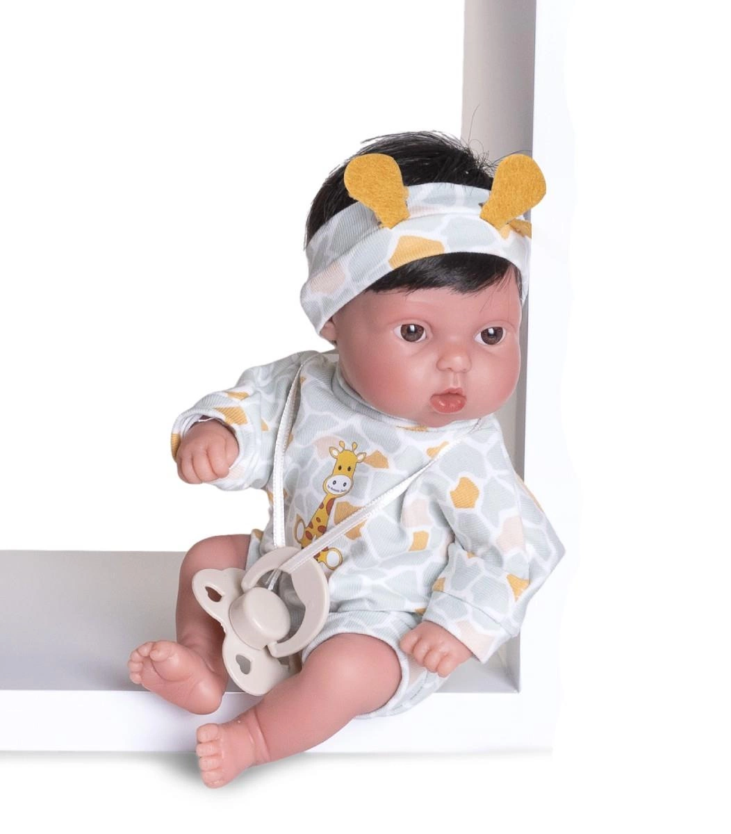 Każde dziecko ma niepowtarzalną okazję stworzyć swoją własną, wyjątkową kolekcję niewielkich bobasów, ubranych w piękne, ręcznie szyte kostiumy. Ta niewielka lalka, ubrana w miękki, bawełniany kostium żyrafy, zachęca do kreatywnej zabawy i wcielania się w rolę troskliwej mamy. Rampers w zwierzęcy wzór, zdobiony uroczym obrazkiem, można z łatwością zdjąć, a lalę przebrać lub wykąpać. Słodka opaska z uszkami dopełnia kostium. Pasujący do ust smoczek na satynowej tasiemce dodaje zabawce atrakcyjności.