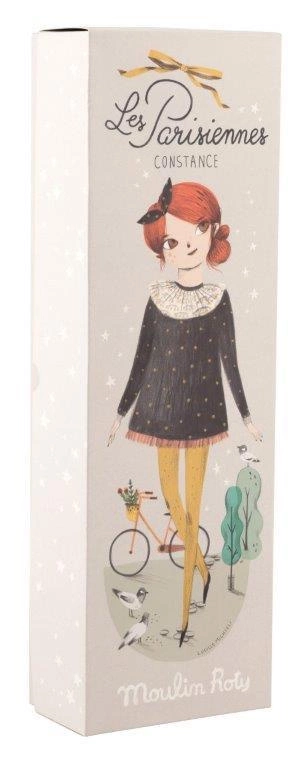 Constance jest niepowtarzalną lalką od francuskiej marki Moulin Roty. Wykonana z niezwykłą dbałością o szczegóły przy użyciu najlepszych materiałów bezpiecznych dla zdrowia malucha. Doskonała przyjaciółka dla każdej modnej dziewczynki. Lalka mierzy 47 cm. Ma kokardkę we włosach i ubrana jest w czarną sukienkę w groszki z długim rękawem i z białym kołnierzykiem. Spod sukienki wystaje różowy tiul. Na nogach ma czarno-różowe balerinki. Zapakowana w eleganckie, kartonowe pudełko, idealnie nadaje się na prezent.