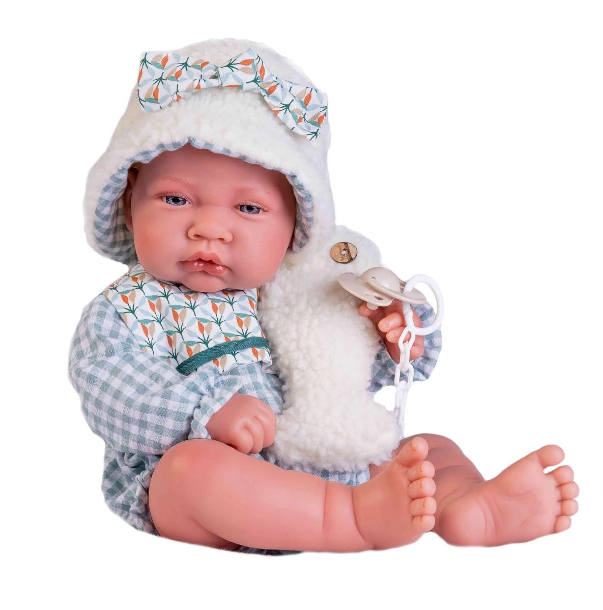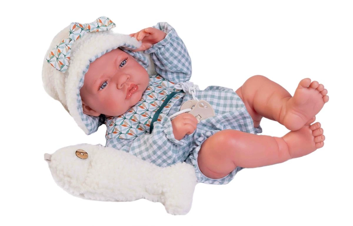 Noworodek bez włosów ma przy sobie pluszowego zwierzaka w kształcie ryby, który idealnie pasuje do jego czapki z owczej skóry. Niemowlę uzupełnia nową kolekcję 2023 bobasów bez włosów hiszpańskiej marki Antonio Juan. Chłopiec został realnie odwzorowany i swoim wyglądem przypomina prawdziwe niemowlę. Ta lala to jedna z większych modeli i ma 42 cm wzrostu. Bobas ma otwarte na stałe oczy. Błękitne oczka wyglądają jak prawdziwe. Oprawę oczu otoczono długimi paskami gęstych rzęs. Laleczka nie posiada włosów, jedynie na jej główce występują rzeźbienia, a powierzchnię głowy przyciemniono, aby bardziej przypominała włoski niemowlęce.