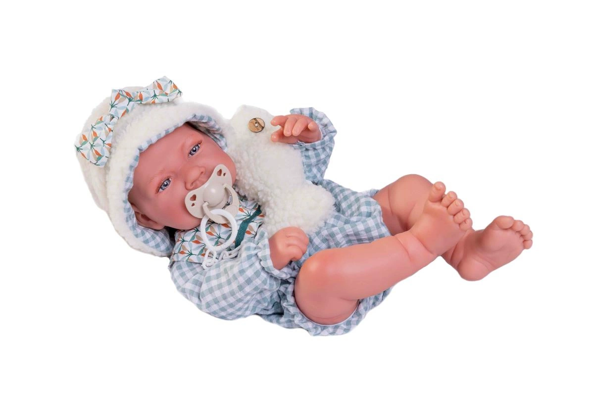 Hiszpańska lala ma na sobie body uszyte z pięknej kratki vichy. Ubranko posiada zapięcie na rzep umieszczone z tyłu ubranka. Taki sposób zapięcia pozwoli na łatwiejsze użytkowanie ciuszka. Dopełnieniem stylizacji jest czapka, która idealnie pasuje do jego zabawki. Dodatkowo producent dołączył smoczek z zawieszką misia. Gdy chłopczyk jest niespokojny i trudno mu zasnąć mając smoka w buzi odpręża się i natychmiast zasypia. Producent z uwagi na bezpieczeństwo dziecka zaleca zabawkę dla dzieci powyżej 3 roku życia.