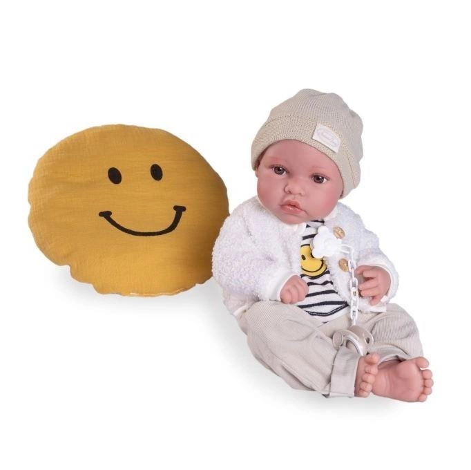 Zaprojektowana i stworzona z dbałością o każdy detal, lalka hiszpańska 50423 to wyjątkowy projekt Antonio Juan. Jedna z najbardziej rozpoznawalnych marek proponuje uroczego chłopca o słodkiej twarzyczce, w zestawie z „uśmiechniętą poduszką. 42- centymetrowy bobas przypomina prawdziwe niemowlę. Ma zaznaczoną płeć. Jest wykonany z gładkiego, miękkiego, bezpiecznego dla dzieci winylu. Zachwyca wysokiej jakości szyty ręcznie strój z aplikacją w kształcie radosnej emotki.